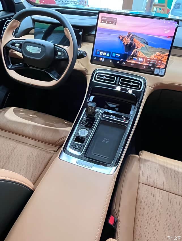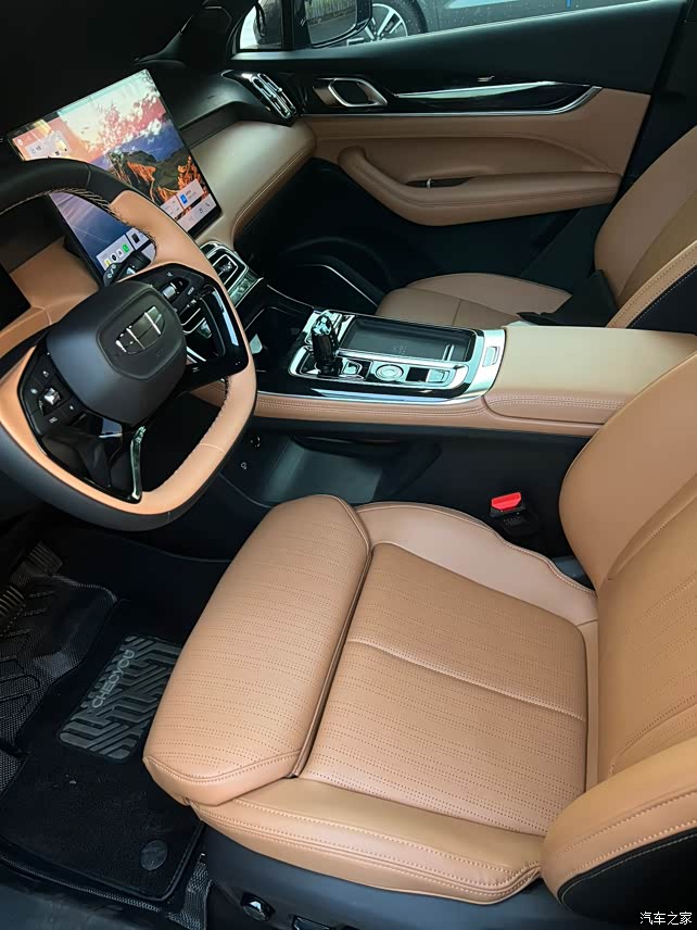 内饰首先就是这个颜色我挺满意的,灰色我感觉有点儿老气,这个橙色有点儿那种爱马仕橙的感觉,高级大牌哈哈哈,这理由找的不错吧。其次就是这个屏幕 特别大感觉,一个油车的车机屏幕这么大的也很少见,而且分辨率是 2.5k,特别清晰。在一个就是这个水晶的档把,高级到没边了哈哈,就是仪表盘不太喜欢,我还是喜欢那种镶嵌进去的运动感十足的那种