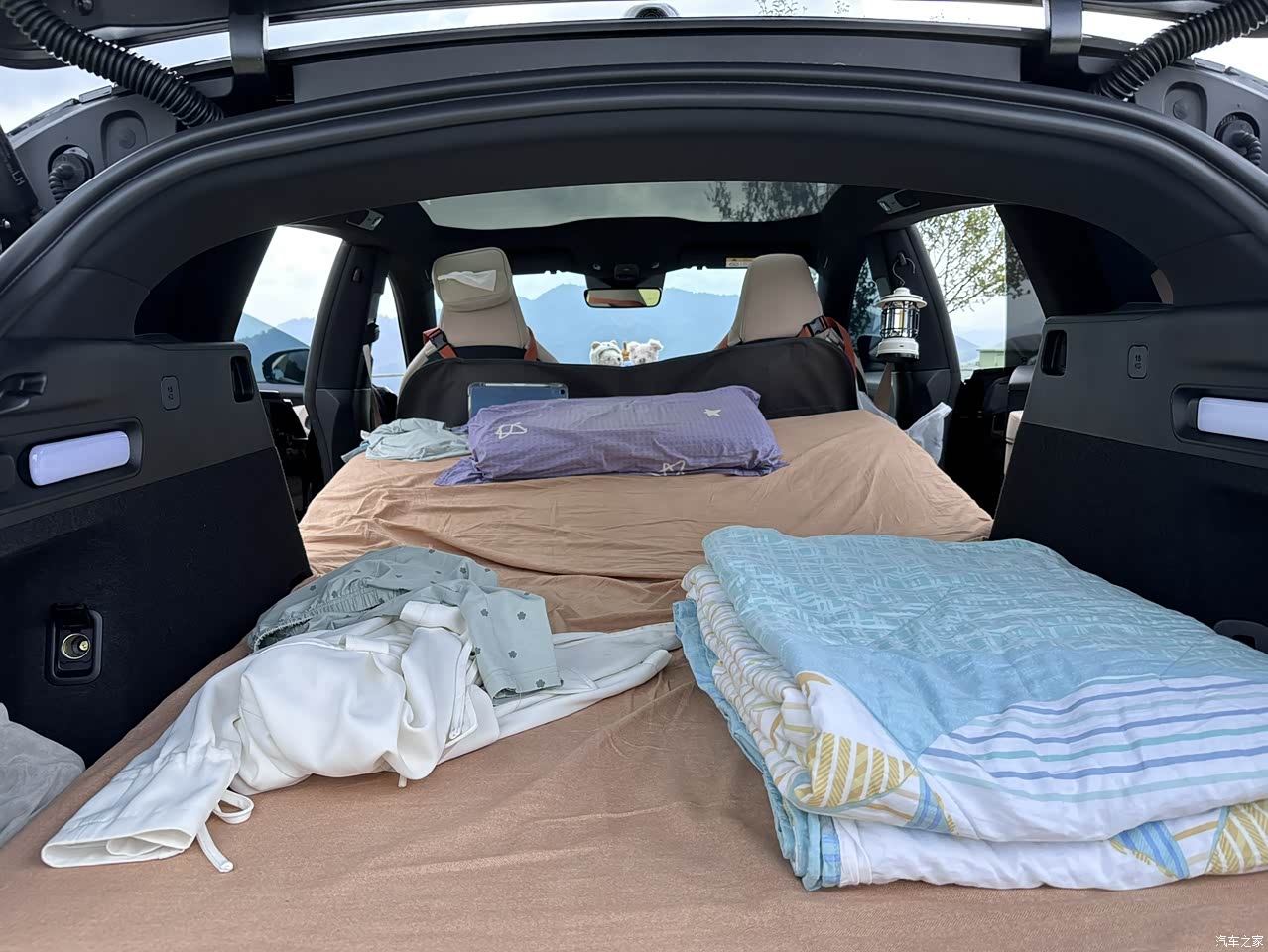 ②空间大非常实用 et5t作为旅行车有着轿车的身材,SUV的空间体验,选装行李导轨还可以加装“小书包”(车顶箱)。 作为露营爱好者,车顶箱上一直放着充气床垫,露营时把后排放倒,充气床垫一放,直接成为移动的小家,空间很大睡觉非常舒服。 如果你是资深钓友或者骑行玩家,后排中央放倒摆放鱼竿和公路自行车完全没有问题。