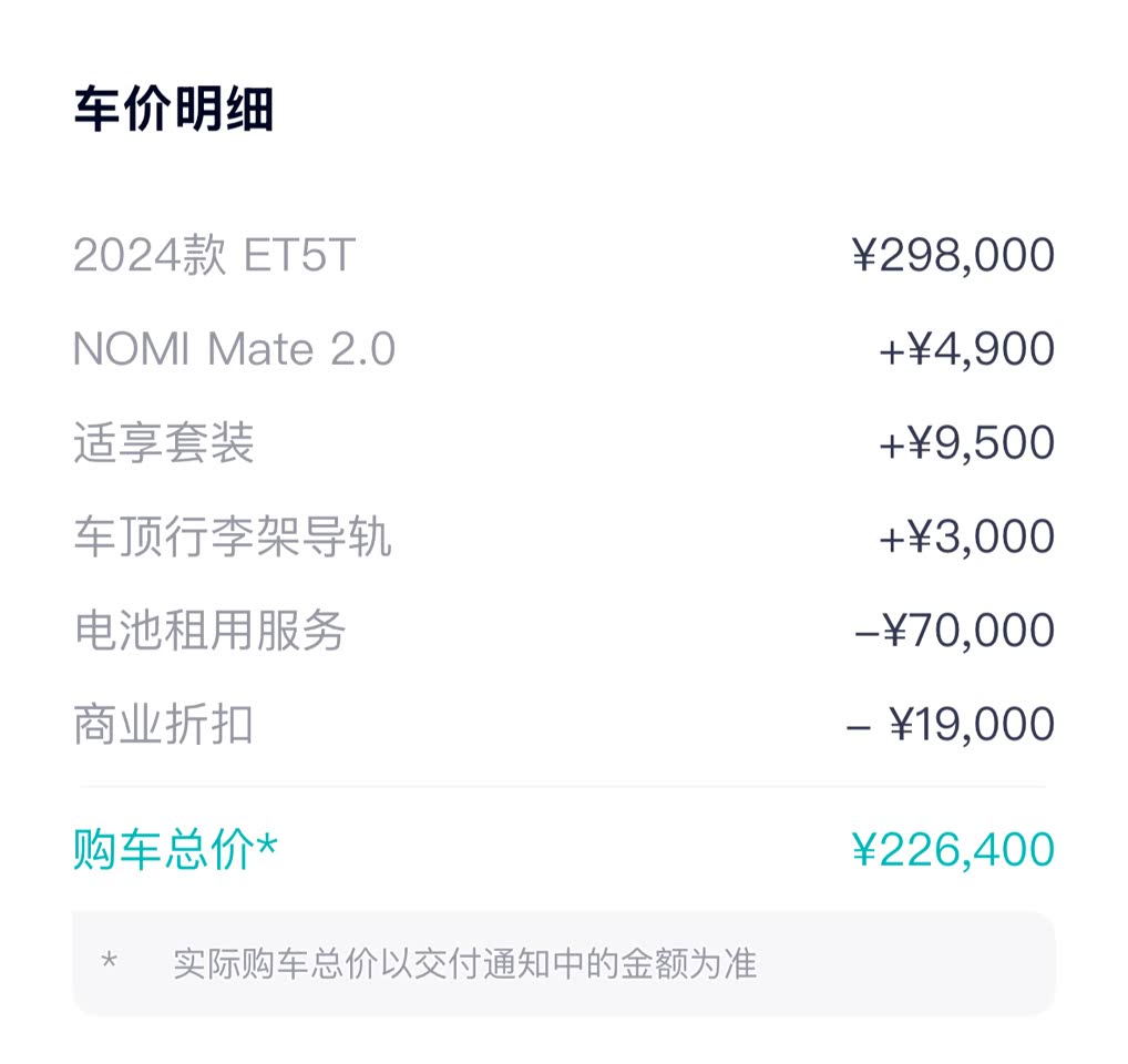 租用电池方案车价直减7w,换电车型直补6000¥,现在还有5年免费换电可折现18000¥,不需要交流转接口还可再降5000¥,再加上5年的智驾免费使用权,