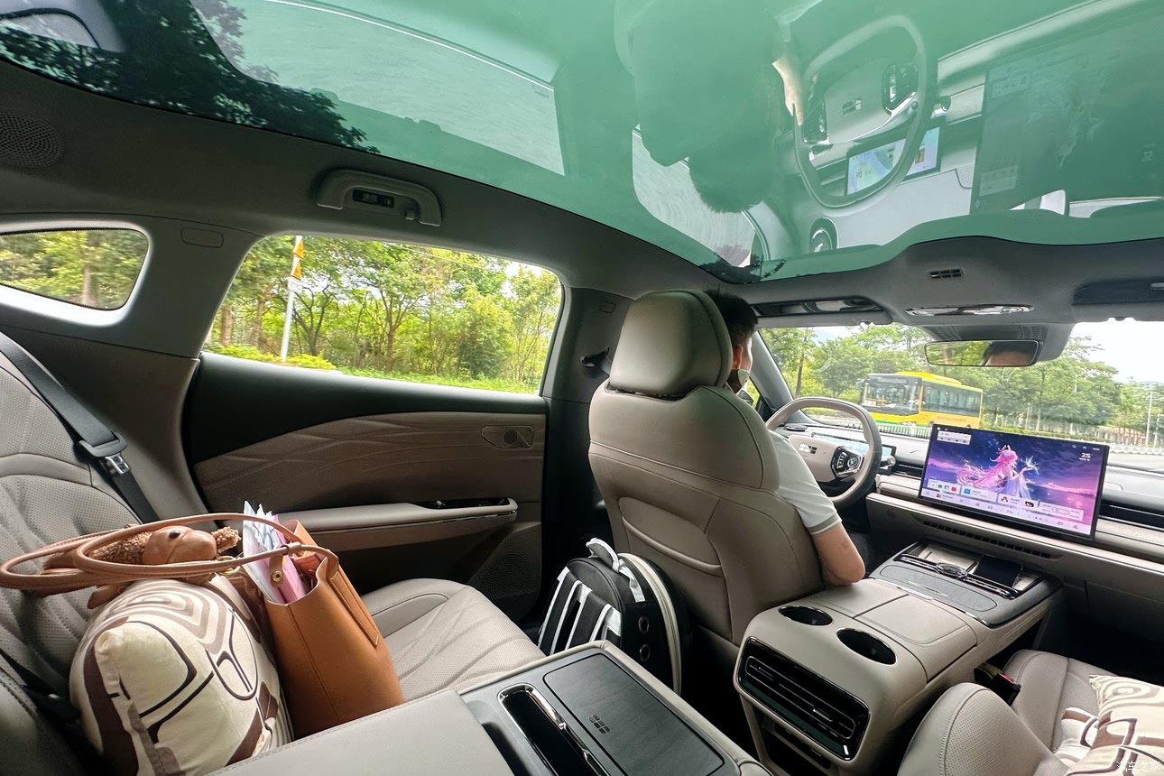 得益于5米多的车长,一米九多的宽度,以及两米九多的轴距,使这款车的空间不管是横向还是纵向都很宽裕,后排跷二郎腿轻轻松松,中间纯平的地台,使得坐中间的乘客也不会难受。