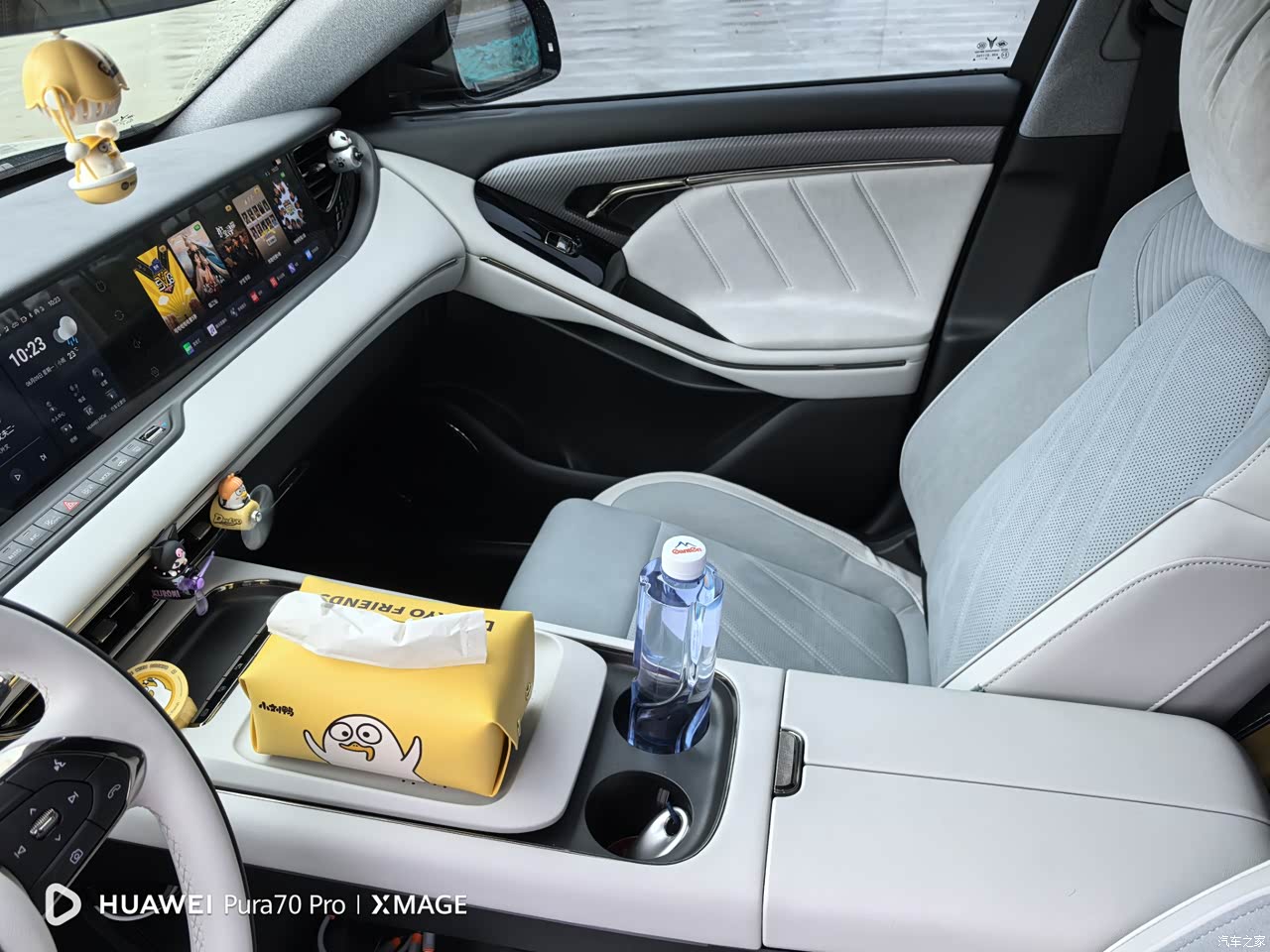 最显眼的就是可升降的中控三联屏,启动时屏幕升起来,有点仪式感。座椅软硬适中,前排带通风和加热,夏天开车座椅不闷汗,冬天早上上车开加热,几分钟就暖和了,对北方车主很友好。不过有个小细节:内饰配色可选的不多,我选的深色内饰,耐脏是耐脏,另外,车内氛围灯颜色有点少,只有几种固定颜色,不能自定义,晚上开车氛围差点意思。