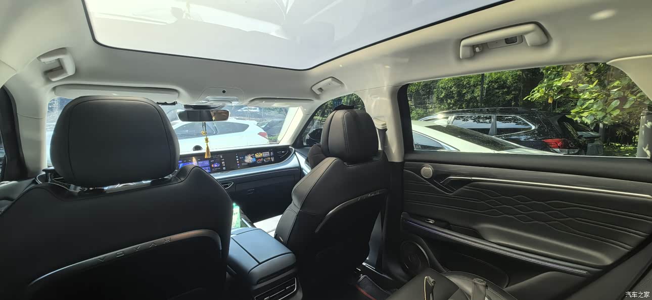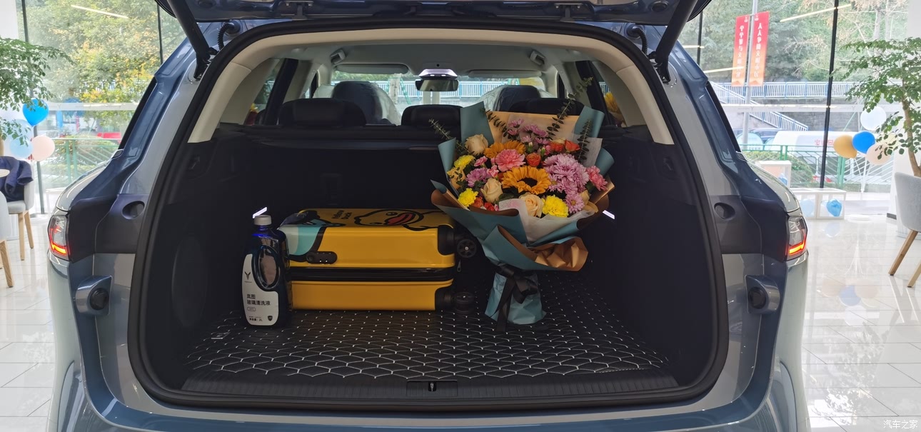 我身高大约175cm,前排座椅调到我舒服的位置,头顶距离差不多一拳半,后排我媳妇带俩孩子坐完全不挤,中间地板几乎纯平,孩子来回蹦跶也不硌脚。后备箱巨能装,俩28寸行李箱+一堆杂七杂八的东西全塞下了,后排座椅还能按比例放倒,搬个婴儿车轻松搞定,储物空间方面,前排杯架、手套箱、门板储物格都挺大,随手放个水杯、手机、钱包没问题。但后排储物有点少,只有门板上的小格子。