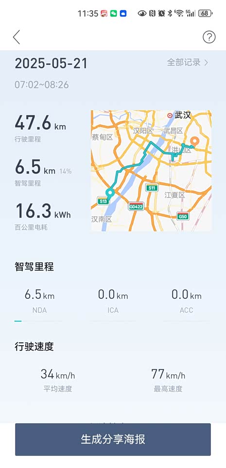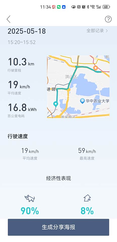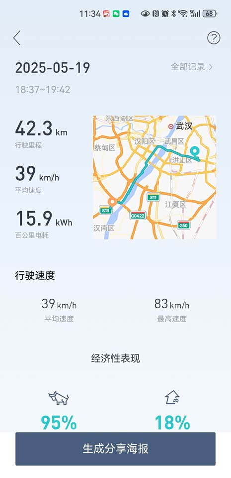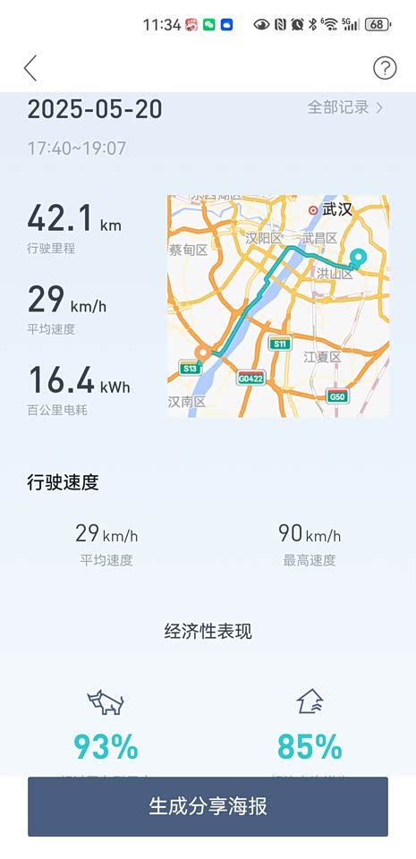 在武汉一直舒适模式跑了2700多公里,每天上下班一共100公里(城镇道路35%,快速路55%,高速10%),目前平均能耗17.5。如果用节能模式跑,到17个内没问题。