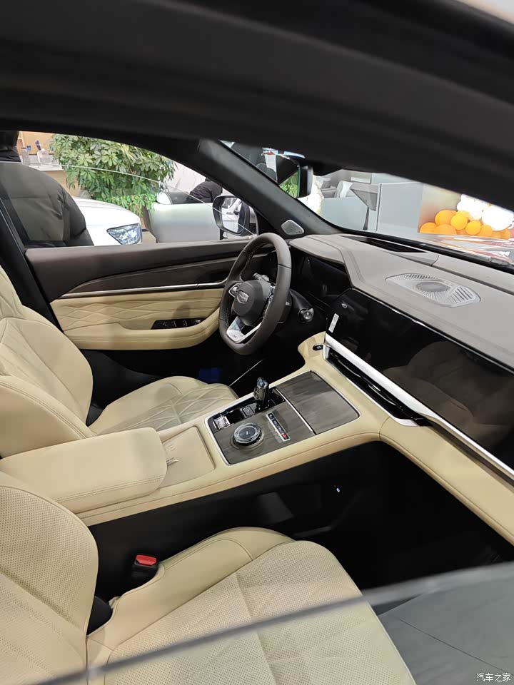 改款后米色内饰非常好看,也比较容易清洁。内饰采用大量软质材料、金属饰板及木纹饰板包裹,触感细腻;后排电动座椅在同价位几乎没有。