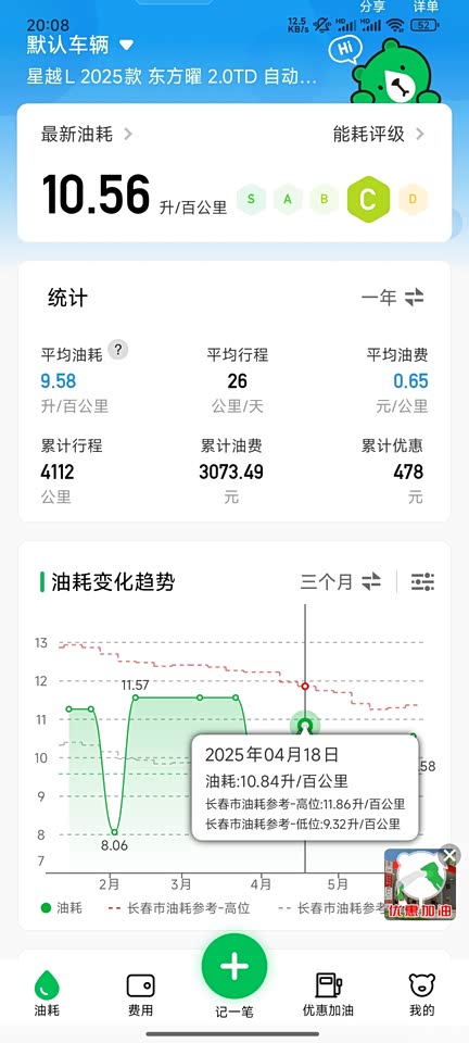 市区油耗略高,但2.0T动力非常棒,加速超车踩就有。不过高速上还是很省油的,最低开过6.4。