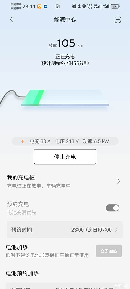 交车给我的时候100%的电量,我的驾驶习惯是空调24.5度、风力1-2格,全程开启音乐,行驶了快200公里的时候,在家桩上充了第一次电,充到100%用了35.5KWh的电量,开到538公里,电量还剩15%,表显还可以行驶115公里,338+115=453公里,续航达成率72%,这个数值不太理想,下次全程高速,再试试续航达成率。家桩充电时间比较慢,电流30A、电压214V、功率6.5KW,从15%充到100%需要差不多11个小时,快充还未试过,下次上高速一定要试试快充,拿到实际数据,再来汇报。