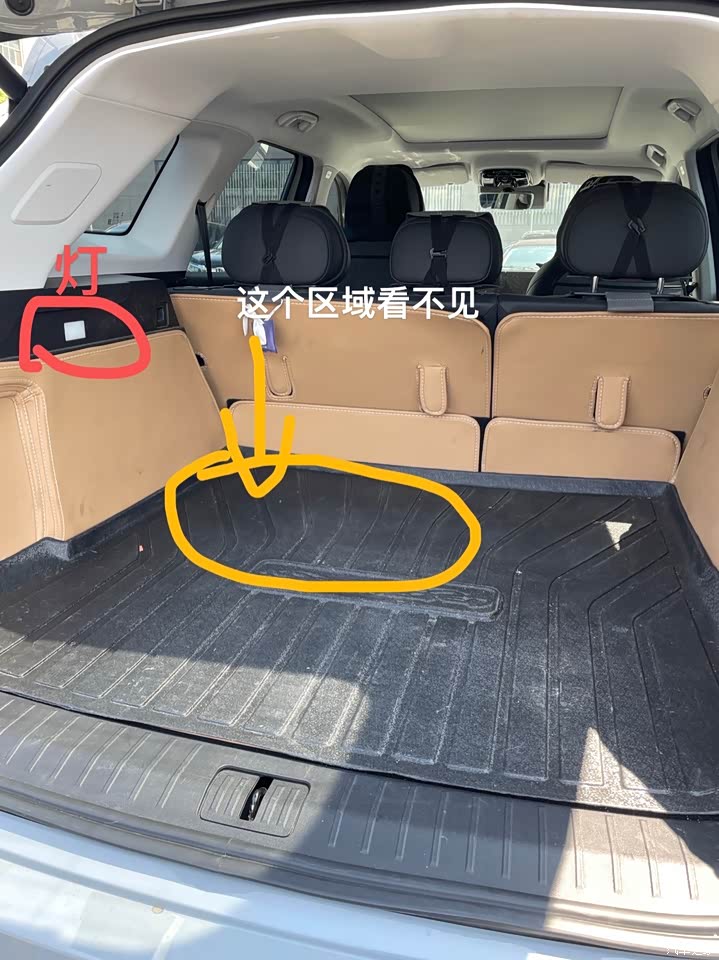 后备箱很大,露营装备轻松放下。后排空间很大,我身高173cm,坐在后排膝盖与前面有两拳半的距离。 后备箱灯是硬伤,晚上在周围环境黑暗的情况下后备箱等刺眼,导致后备箱有一片区域看不见,如图所示。