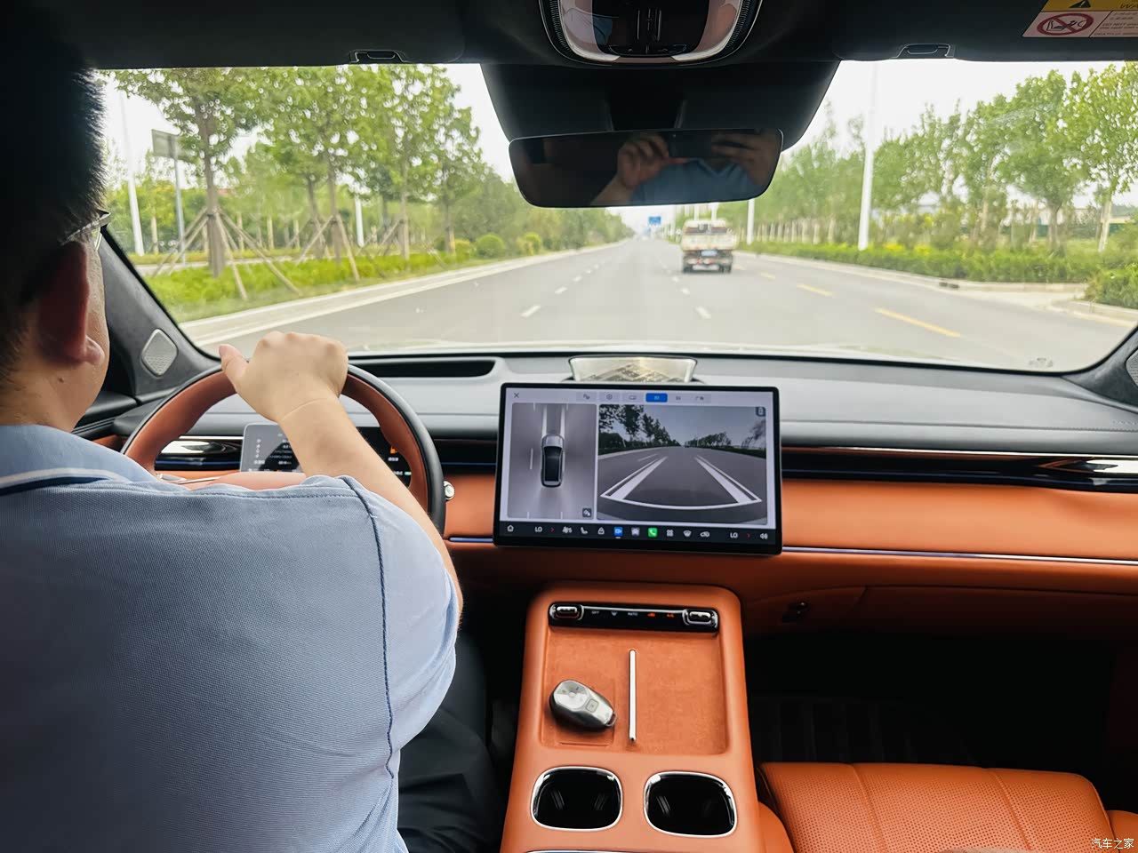 怀档的设计刚开始使用时有些不习惯,但熟悉之后发现非常方便,操作简单,节省了中控台的空间。此外,车辆的外后视镜调节没有实体按键,倒车后视镜也没有自动下翻功能,对于需要观察后车轮是否蹭到马路牙子的情况来说,操作不太方便,需要在中控屏幕里找到后视镜调节界面,然后再拨动方向盘上的滚轮,太别扭了。