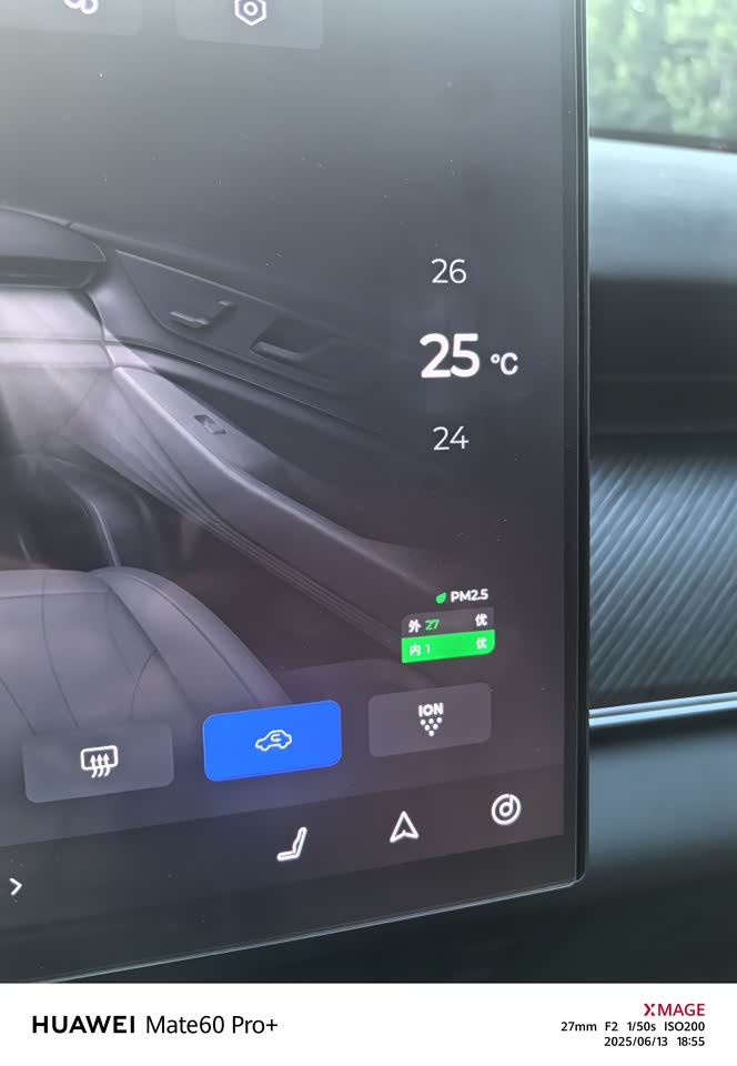 座车里空气质量很好,点赞。尤其是室外有农村燃烧的草烟、有机肥异味,都自动关窗,打开过滤。