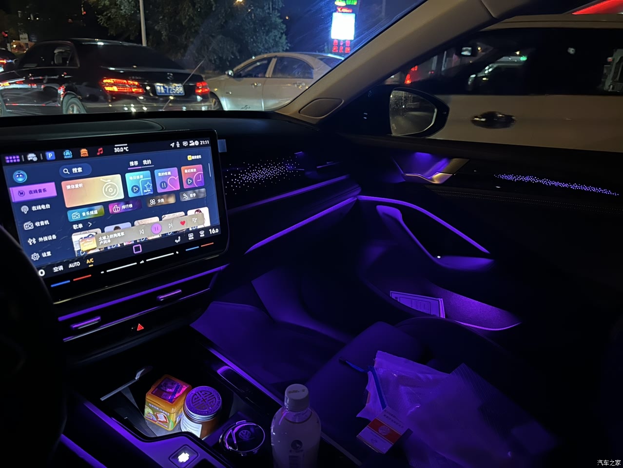 最满意的当属车内氛围感了,氛围灯设计的特别棒很新颖,高级感很强烈!可以随意设置喜欢的颜色搭配,调节明暗度,紫色最好看哦!门板上的灯光也很好看,后排门板上也是有灯光的