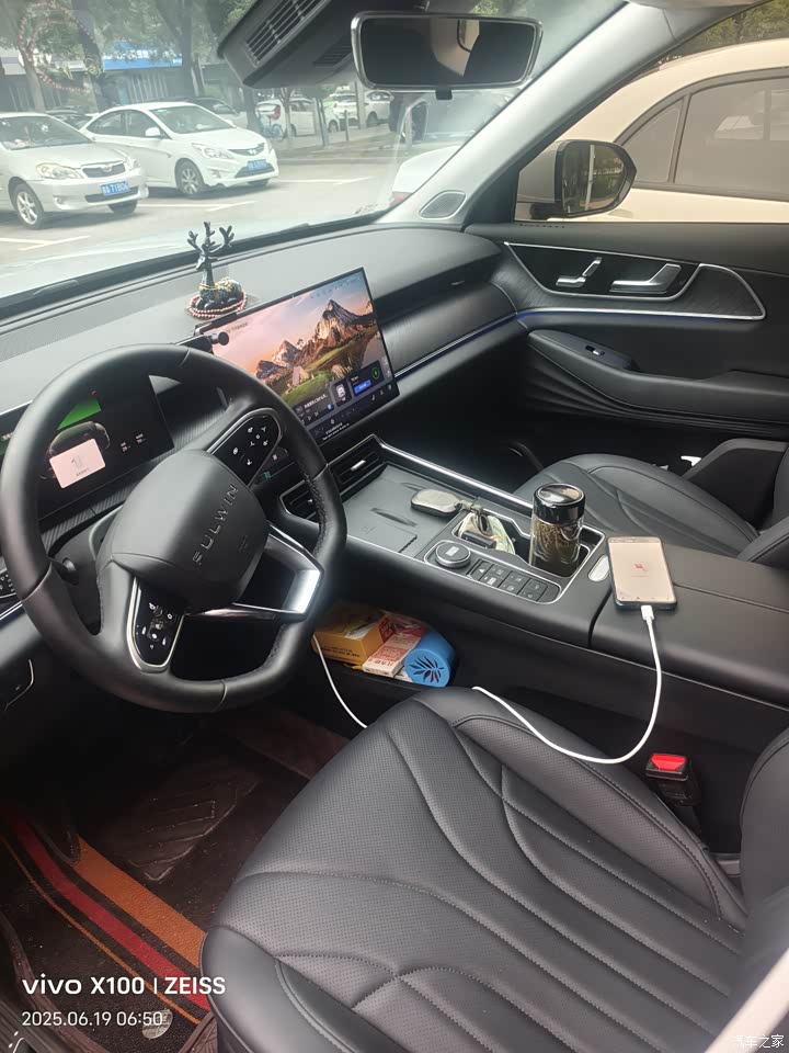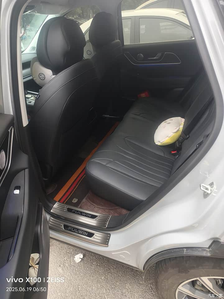 内饰用料还行吧,中控台及门板一些地方都是软质包裹,也不知道是什么材料。座椅舒适度还是不错的,前排座椅还带了通风跟加热,不管是冬季还是夏季很实用,第二排座椅靠背好像有两节可调,座位坐3个大人一点都不挤。空间也还好很给力,群里有个别车友说制冷效果不好,我还没发现什么异常。