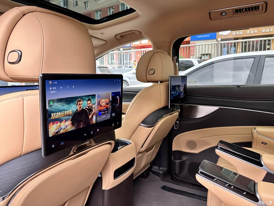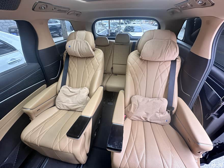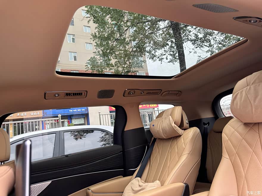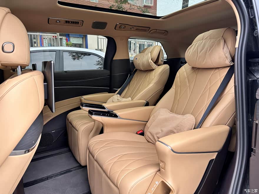 内饰方面材质用料上确实是很良心,首先全车座椅都用的Nappa真皮,坐上去柔软舒适承托性好,配合中排16点的气动按摩,简直就是头等舱的享受,而且前排也有10点的座椅按摩,有效缓解长途驾驶疲劳。另外我还比较喜欢的一个功能是压缩机冷暖箱,能实现-6℃至50℃温控范围,实测冰镇饮料达4℃需35分钟,保温辅食可持续6小时以上,简直就是神器。还有扶手屏上有座椅的调节模式,四人舒享、七人舒享、七人满载,相当好用,完全可以充当三个座椅位置记忆使用。