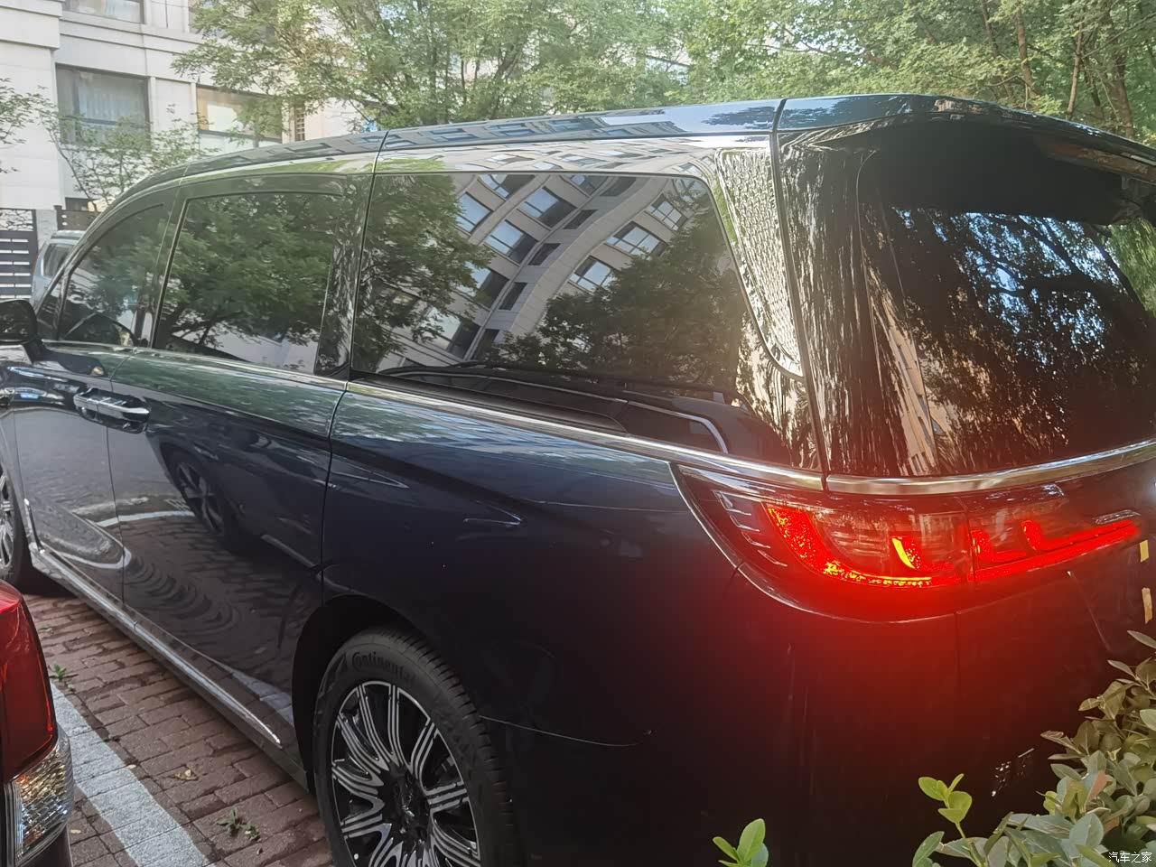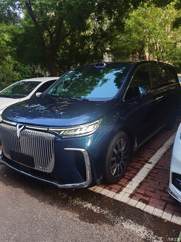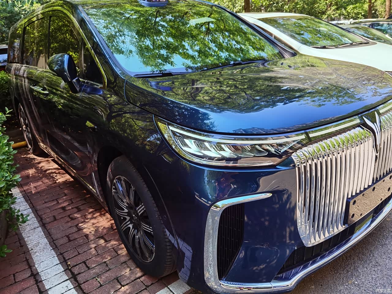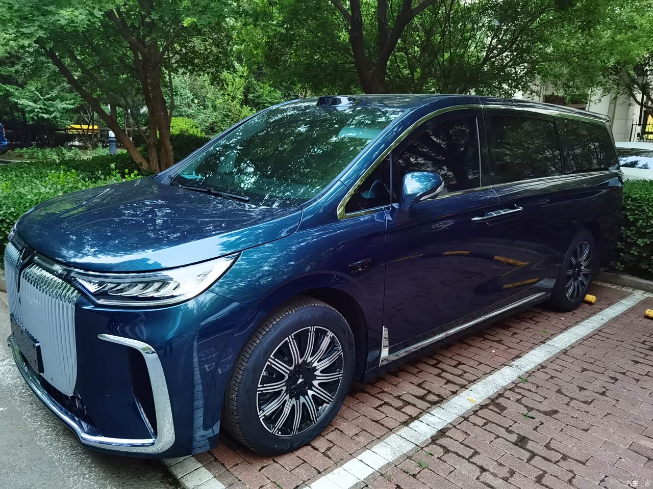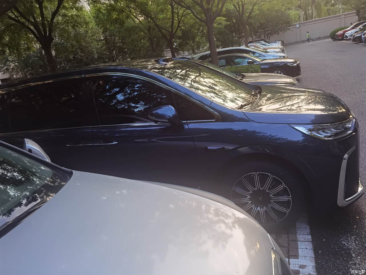 辉月青的车漆在不同光线下变化特别丰富,大太阳底下泛着金属质感的蓝色,阴天的时候又显得深邃雅黑,商务场合开出去特别有气场。车身线条硬朗,直瀑式镀铬格栅和贯穿式灯带,老远就能认出这是岚图梦想家。20英寸的星芒轮毂,亮面和哑光双色设计很时尚,车尾的鲲鹏展翅尾灯组,点亮后辨识度极高,不过辉月青色车身确实不耐脏,下完雨车身全是水渍,得经常洗车。我现在基本每月都要洗两次,不然看着特别难受。而且车漆挺薄的,稍微轻微剐蹭就露出来底漆。