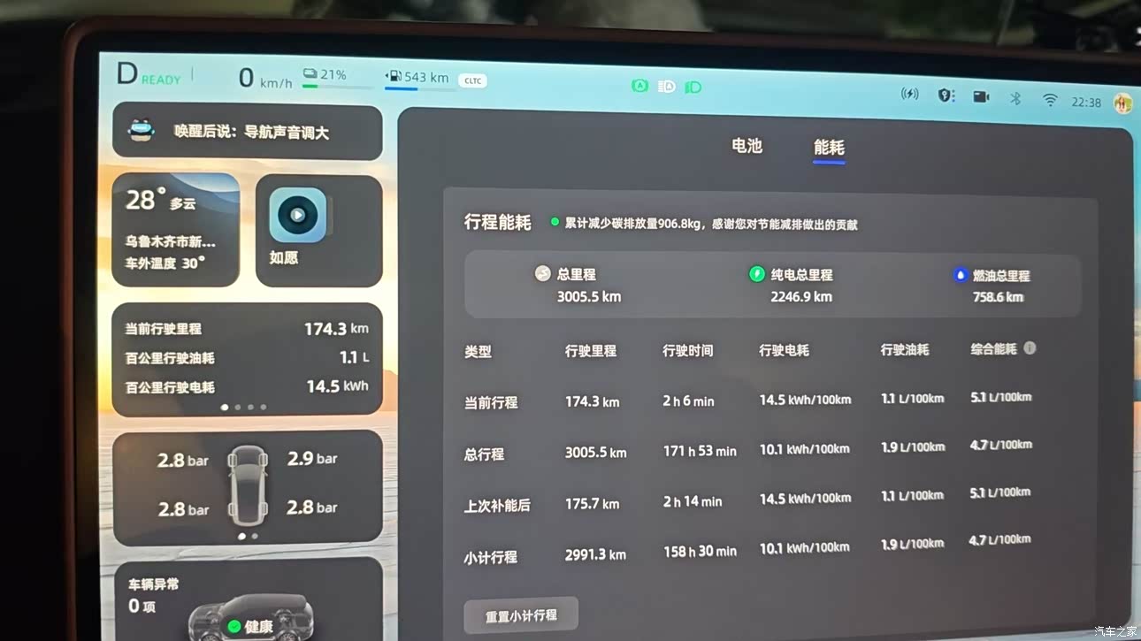 日常在城里,它的纯电续航有215km,接送孩子上下学、去商场购物、周末在周边逛逛,一周充一次电就足够了,既安静又省钱。偶尔忘记充电也没关系,它的馈电油耗低至4.3L/100km(NEDC) ,相比以前的车,加油的次数大幅减少,每个月算下来,养车成本降低了不少,真的是很贴心。