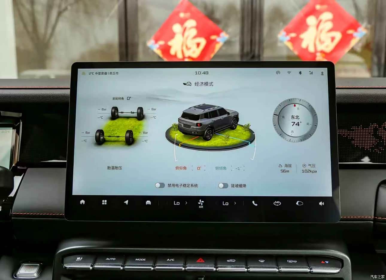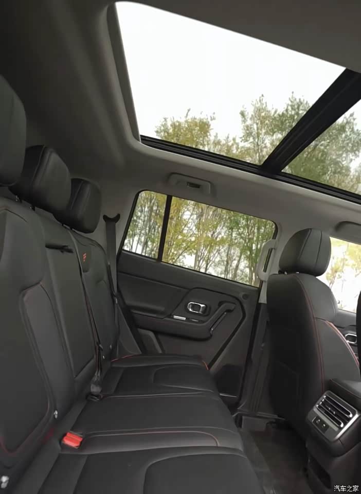 内饰充分体现了"轻越野+精品质"的设计理念。其驾驶舱采用分层式布局,中控台大面积覆盖软性材质并搭配金属拉丝饰板,既保留越野车的硬朗线条又提升质感。10.25英寸全液晶仪表与12.3英寸悬浮中控屏组成双联屏系统,搭载Lion智联系统支持车载微信/高德导航等智能功能。座椅采用立体剪裁仿皮材质,主驾配备6向电动调节及腰部支撑,后排靠背支持15°角度调节。独创的"星空矩阵"空调出风口配合256色氛围灯,夜间可呈现流星划过效果。保留实体按键的空调控制区与游艇式电子挡把形成强烈机械美感,全车21处储物空间包含隐藏式雨伞槽和可拆卸后备箱工具箱。同级罕见的CN95级空调滤芯搭配AQS空气质量管理系统,在越野场景下也能保证座舱空气清新。