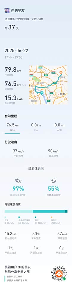 HL的驾乘体验 首先第一次驾驶昊铂HL,强劲的动力性能,搭载了250kw电机,动力响应迅捷,推背感强烈。昊铂HL开起来也非常安静,全车双层隔音玻璃,车内静谧性优异。空间表现不错,很多人觉得第三排太小,但是对比过理想L8和问界M8,HL的第三排空间算很不错了,重点是HL第二排有两个零重力座椅,父母坐在零重力座椅上,可以享受座椅按摩,前排和第二排座椅都带有通风,加热功能,运动风格座椅,包裹性佳,长途驾驶也不会感觉累,之前开雷凌跑长途脖子就会酸。 HL还搭载了大尺寸AR-HUD抬头显示,对驾驶员起到很大帮助,不用老是看仪表盘,提升驾驶安全性。 昊铂HL还有后排娱乐屏,小孩子一上车就马上喊“你好,昊铂”打开电视,我要看小猪佩奇,以前坐车都是吵吵闹闹的,现在有了电视,就可以安安静静的看电视了。 HL智驾及续航表现 昊铂HL全系标配1颗第二代可变焦激光雷达(探测距离300米)、11颗摄像头、3颗毫米波雷达及12颗超声波雷达,配合高通8295P芯片的车机系统,实现毫秒级环境建模与决策响应。搭载NVIDIA DRIVE AGX Orin芯片,具备254TOPS的算力,支持每秒254万亿次运算,为智能驾驶系统的高效运行提供强大计算支持。 双电源系统,保障系统稳定运行,提升可靠性。 有了这些硬件的支撑,现在出门都喜欢打开辅助驾驶,最远的一次是上周去增城摘完荔枝,回程时全程都是开启辅助驾驶,全程80公里,无接管。广汽为用户也赠送了一年300万的智驾保险,这应该还是第一个敢为自己的智能辅助驾驶提供保险的车企。 目前在使用智驾过程中也存在一些小问题,比如有一次识别ETC车道时,未识别到ETC车道,走了人工通道。再者是ETC车道上应该是误检测,行驶到一半时直接就停在那里,需要自己给点电门才会继续行驶。 在续航方面,做了一段小测试,从番禺出发,去天河昊铂东圃店,全程是27公里,出发前表显剩余709KM,到达目的地后表显679KM,续航掉了30KM,那27/30=0.9,续航达成率是9成,这么大台车,这样的续航力算表现不错了。 使用了1个月总结出来,开启智驾的电耗会比自己开还要低。 在补能方面,我都是使用私桩充电,还未体验超充速度,昊铂的购车权益有赠送一年免费2000度电,其中1600度限于广汽能源的超充站使用,有400度可以在蔚来,极氪的超充站使用。 总结:用车1个多月,驾驶体验很好,家里人的乘坐体验也很棒,拥有昊铂HL,家庭的幸福指数也提高了。