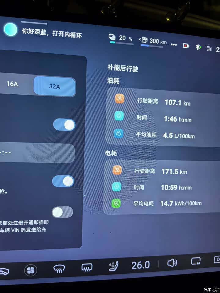 买这个车有三个月了,一直没来的分享使用感受,今天就来分享一下吧! 买这个车之前有关注过其他的车系:东风的风神、银河L7,Uin-z、东风奕派、零跑、sl03;其实早就想换车了,可是家里人不同意,一直到25年家里人同意了才把原来那个开了9年的英朗卖了换的这个;起初看的的油车uni-v,看的挺好看的,换车了一定买这个,后来去车展上看到深蓝的sl03还不错,比Uni-v更好看更好一些,就关注了一下,后来因家里人不同意就搁置了。直到今年家里人同意了就去看看其他车系对比一下哪个好看哪个适合我,看了其它的车系比亚迪那些,感觉都不错,就是纯电行驶里程太短了,还有就是路上看到的也多,就放弃了,其他的品牌也不错,就是纯电行驶太少,都放弃了;还有零跑也不错就是电池不太行,和品牌力差了点,才选的深蓝:当时那年出来的S7一看还可,就是没仪表,就不考虑了,不知道今年鬼使神差的就远择了它,可能是自己想要的,so7都有吧,比如:超级增程、285的续航、3c快充、漂亮的外观,这些都符合我的需要;对比一下零跑可没有那多的优点,只有续航和无框车门一样,其它的都比不过深蓝;还有就是一开始想选插混的,毕竟动力都是不错的(适合跑高速(风神L7))可是一想哪有那多高速要跑,我基本都是郊区/省道,所以就买个增程suv,纯油的是不会考虑的,要不然换车干嘛?之后的使用我选择是对的!!! 说下感受吧:智能化和座舱都不错,动力也不错,确保安全的前提下想超车就超车,那动力随叫随到,比之前的油车好太多了……再行驶中也没什么异响,这点还不错的(可能是概率问题了)至于买了就降价,这点我不在乎,买了都买了,况且车本来就不值钱,只是代步而已,最主要自己喜欢就行! 最最不满意不满意的地方就是续航了,那真叫一个失望,拉胯,电耗也不高,脚法也很好,动能回收一半、也不跑高速,不开空调的情况下(4/5月份)只能跑160/170km,太失望了,很郁闷,所以对这车感受和喜欢度都下降了。 欢迎各位车主发表你们的看法和感受……