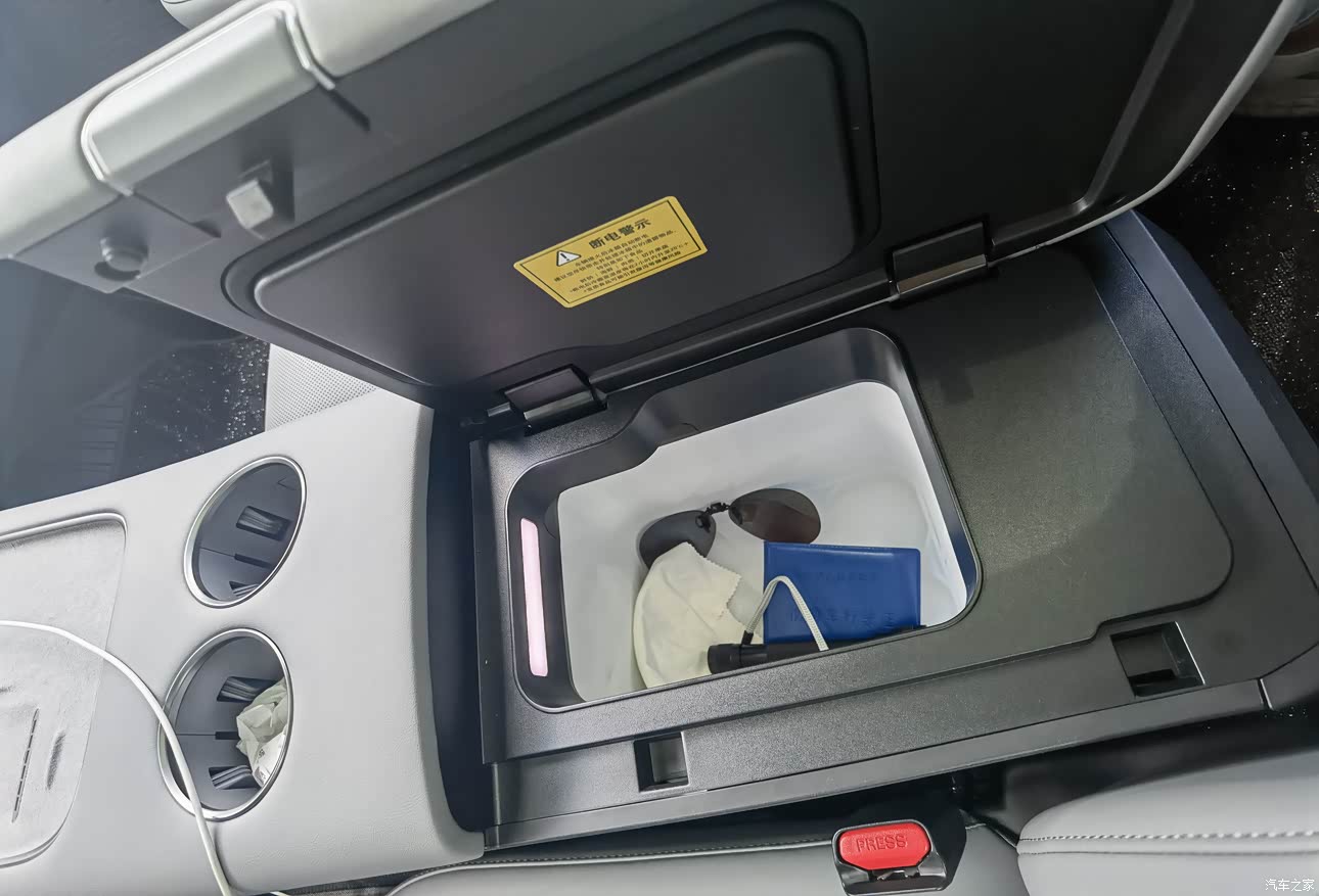 内饰给我一种家的感觉——主副驾的AI零压云毯座椅,后排座椅一样柔软贴肤,还有顶棚上的麂皮,简约风的中控仪表台的细腻触感,化妆镜的小灯光、升降扬声器、扶手下的小冰箱...这些亮点细节都十分打动我。