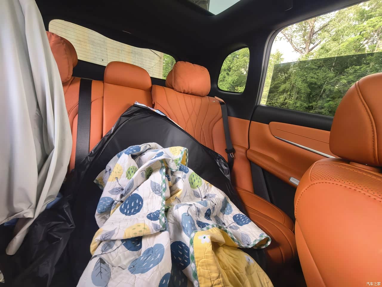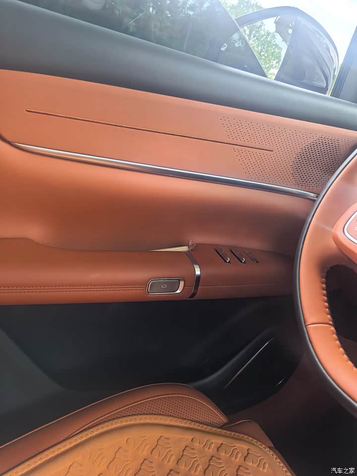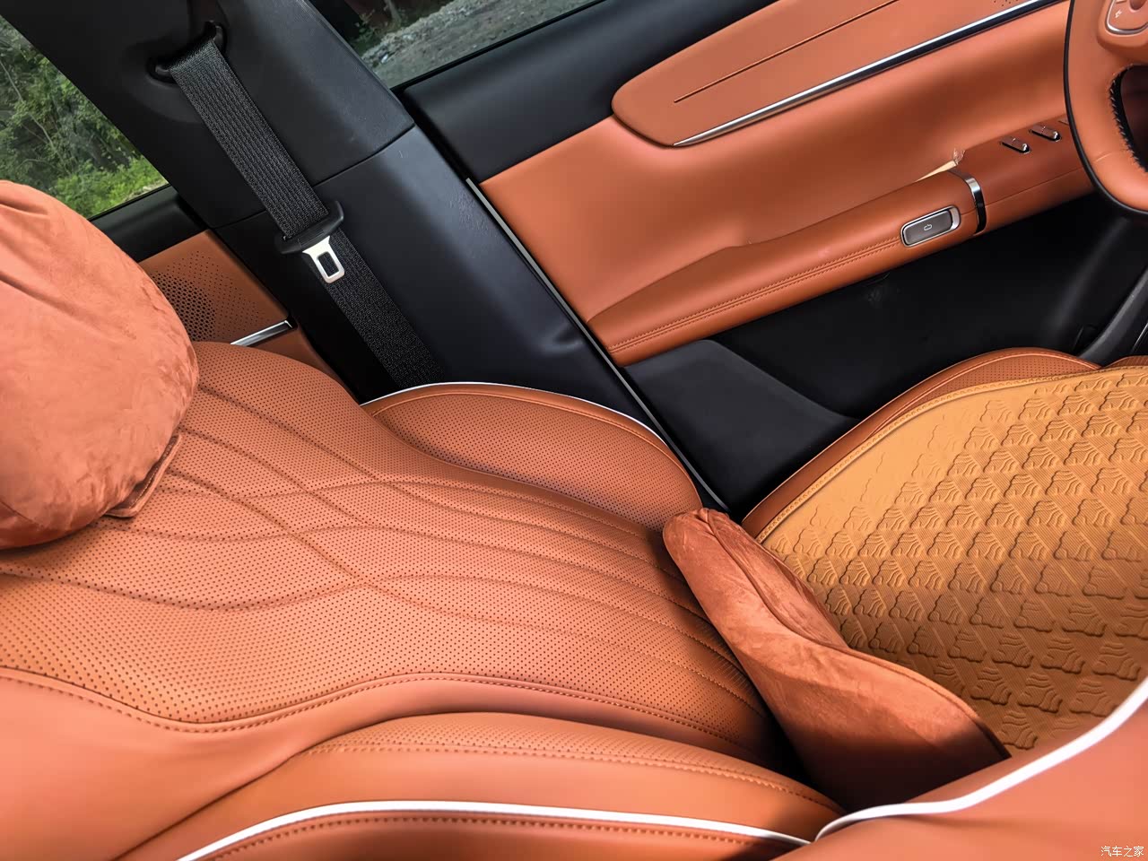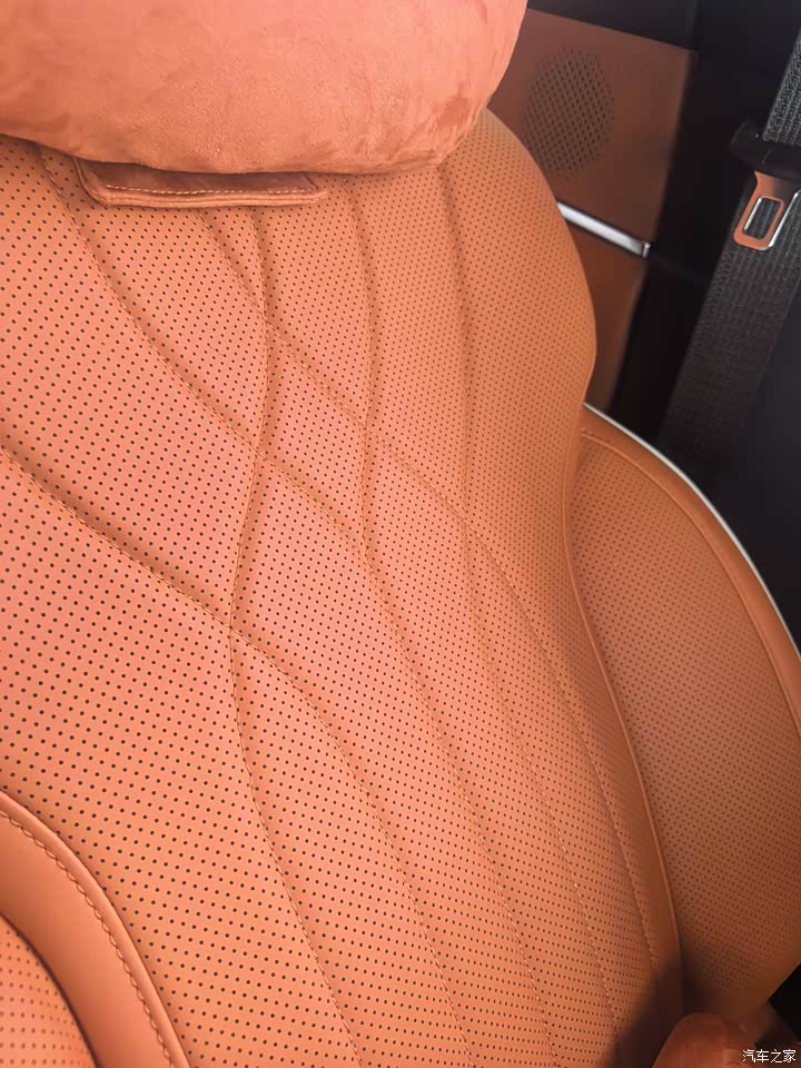内饰:质感在线,营造温馨座舱 坐进车内,橙色皮质内饰瞬间抓住眼球,和黑色车顶形成鲜明对比,时尚又温馨。座椅的菱形纹理精致细腻,皮质柔软得像家里的大沙发,每次坐上去,都有种被温柔环抱的感觉。车门内饰也是同色系皮质包裹,触感细腻,拼接处的缝线工整,细节见真章,满满的豪华感。