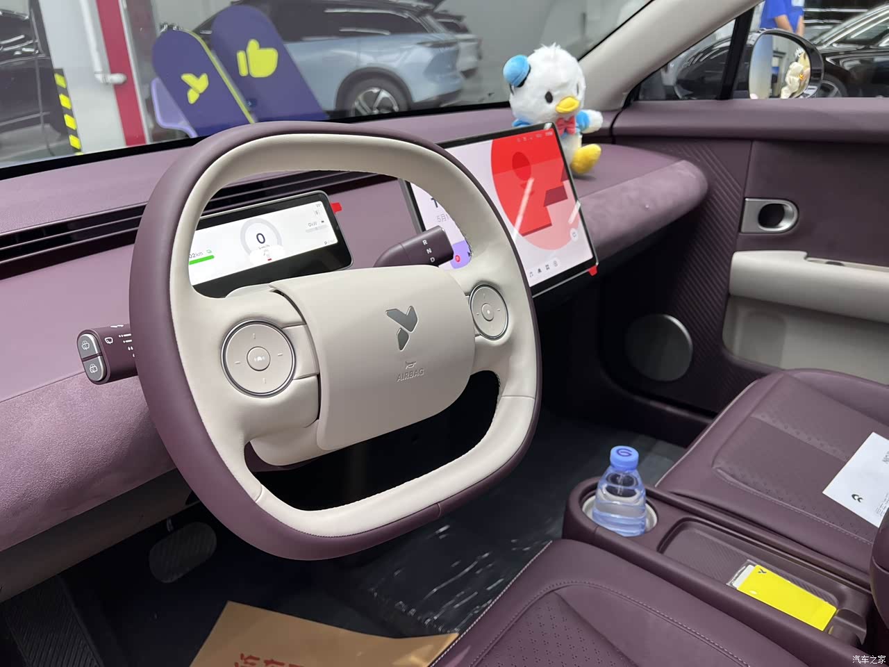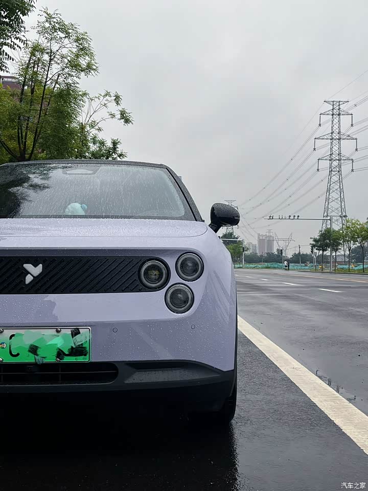 我选的是发光版,紫色车身配紫色内饰,还选了轮毂,看着又青春又有格调! 这萤火虫的大灯太有辨识度了,三个一组的造型,开在路上回头率超高,直接化身街上最靓的仔!晚上大灯一亮,还能玩灯语特效,科技感拉满。而且这车特别适合改装,不管贴拉花还是改颜色,怎么捯饬都好看!
