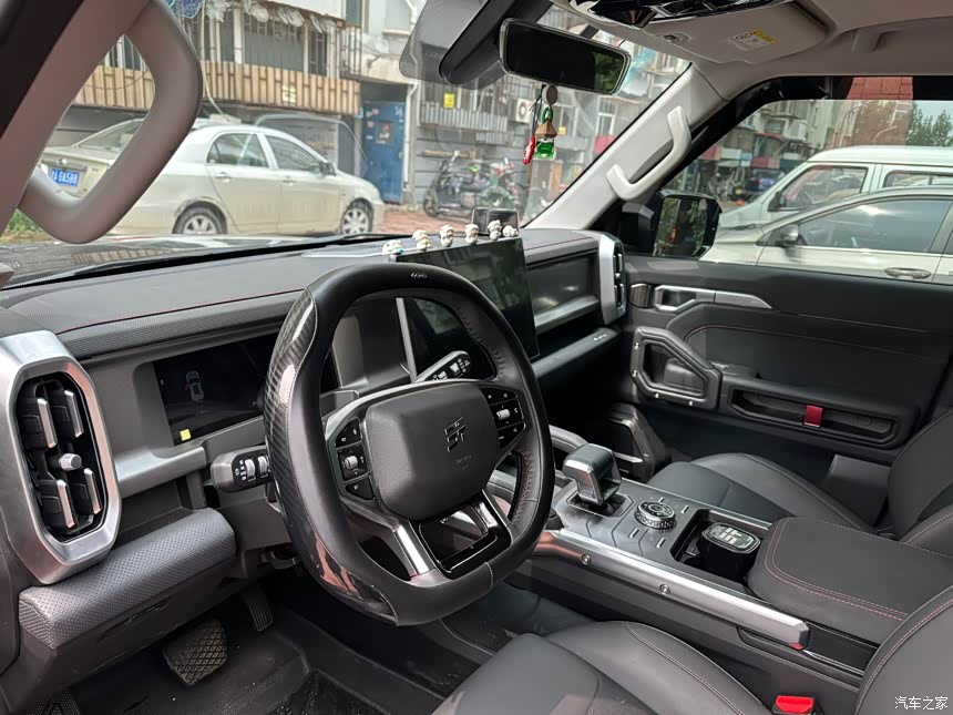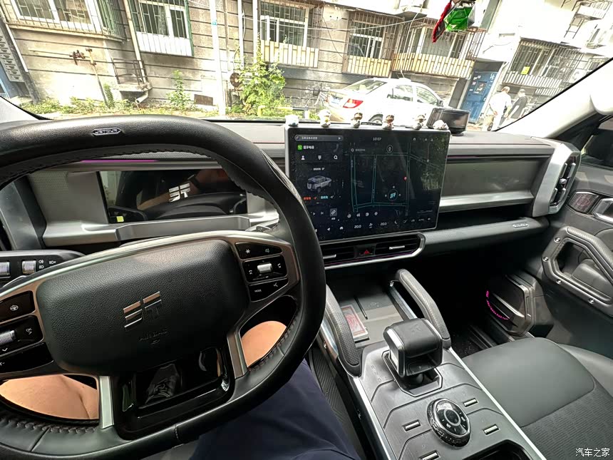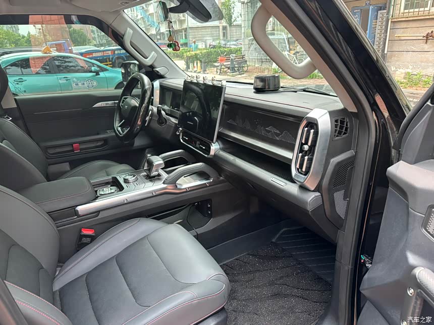 内饰氛围到位,配置够意思! 坐进去第一感觉比预想的好太多了!用料虽然谈不上多豪华,但设计感很强,硬派风格里透着点精致。门上粗壮的拉手,圆形的空调出风口,大尺寸中控屏,整体氛围营造得很到位,不像有些车那么塑料感。配置上,发现Pro该有的基本都有了:全景天窗(看星星神器)、360度全景影像(窄路会车和停车神器)、主驾电动调节、座椅加热(冬天福音)、智能车机(语音识别还行,导航听歌方便)、无线充电(手机忘充电也不慌),日常用起来很顺手,尤其是360影像,对这么大个头的车来说太友好了。