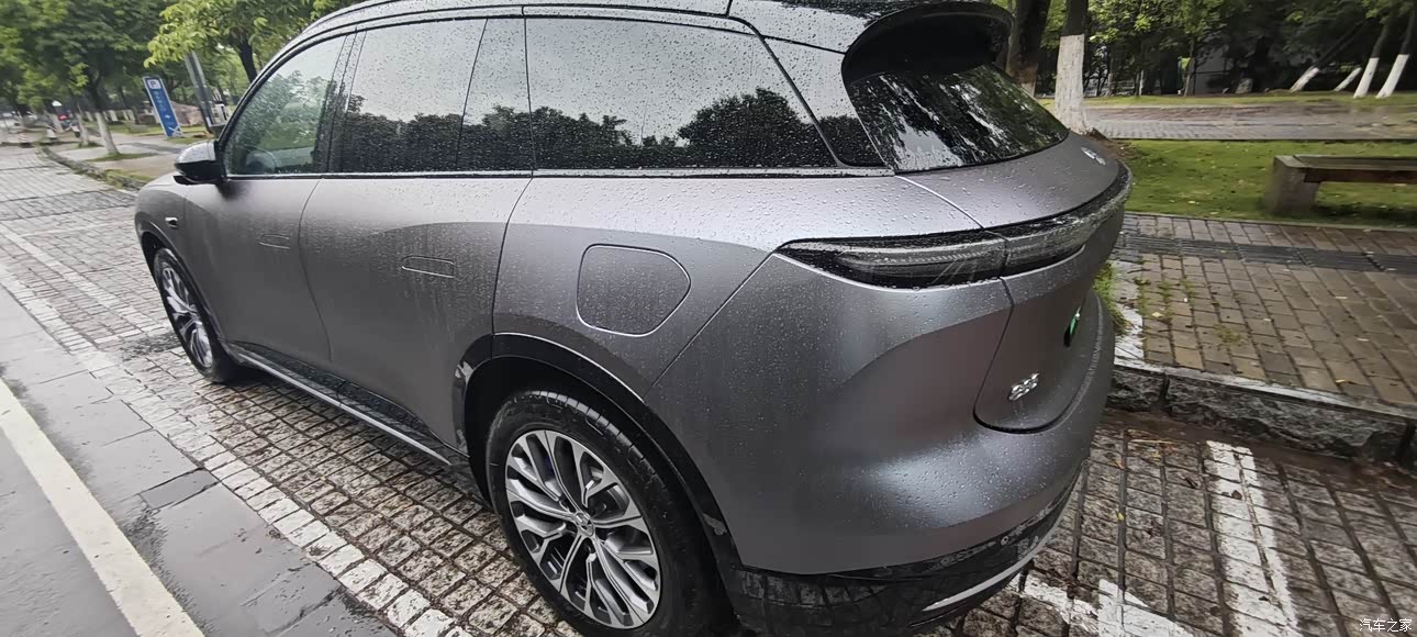 25款ES6车头线条略微上扬且更加平直,配上加粗的日行灯,气势上显得硬朗不少。 侧面腰线两条隐约的弧线搭配,加上b柱后下行的黑色边框,让车身保持大空间的同时,没有笨重傻粗的感觉,凸显灵活运动,曲直兼顾,男女通吃。 尾部我最喜欢晚上的灯光效果,贯穿型尾灯简约不繁冗,两侧略略加粗的线条,应该是之前老款北斗型尾灯的继承演化,辨识度很高。 轮毂选的雪织,20寸,是我比较偏好的条幅造型,兼顾了美观与续航。 蔚来车型好看的颜色都要加1w,新车小剐蹭也很麻烦,贴车衣保护一下更好,所以这次提完车第一时间就去改了色。 选择卡普里灰紫,主要看上了它稳重低调的灰银夹揉奔放浪漫的紫色,让新车具有了双重性格。不同光线与角度下,车身变幻出神秘难测的颜色组合,百看不腻。紫色的卡钳隐藏在银色雪织轮毂下,若隐若现,更加重了又要内敛又要张扬的矛盾质感。