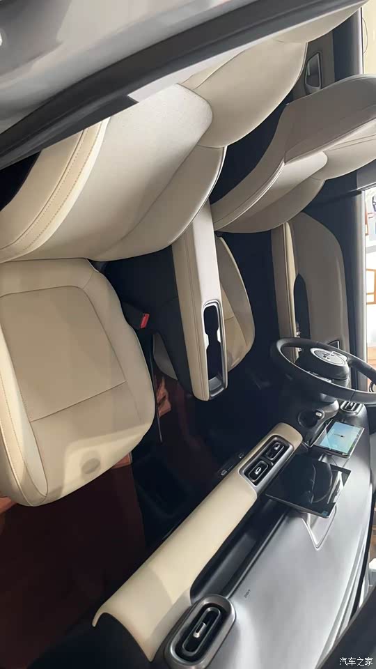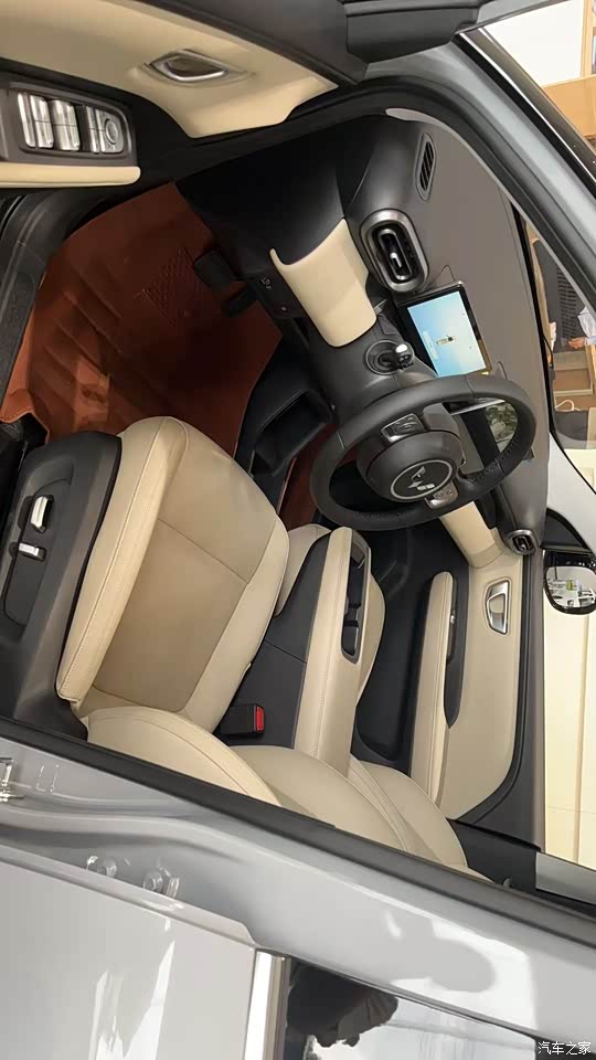 整个中控台设计简洁流畅,大量使用了软性材质包裹和仿陶瓷釉面质感的面板,搭配精致的镀铬装饰和复古的椭圆元素(如空调出风口、门把手),营造出远超价格的质感和设计感。座椅采用仿麂皮与皮质拼接,填充物柔软舒适,包裹性不错。