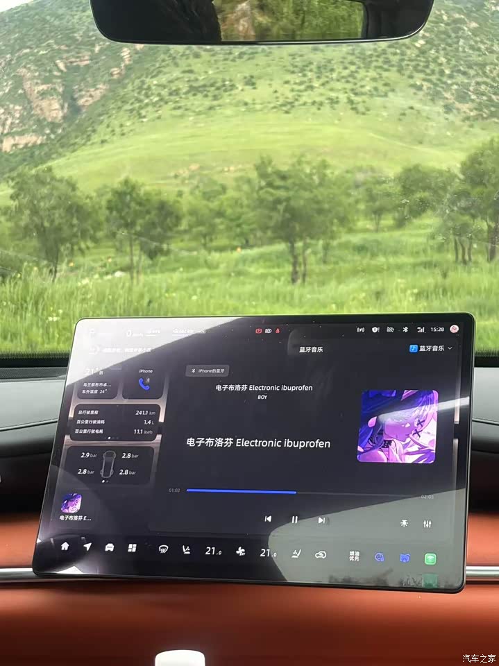 我购买这款内饰选择橙色,颜色鲜艳,不会显得特别沉闷,从车里拍外面的风景色彩对比像画一样美丽,如果能出更多内饰颜色选择就好了。 内饰也十分简洁,但不“简单”,古老的按键基本没有,全部由车机掌控,车机也十分丝滑,功能很全。