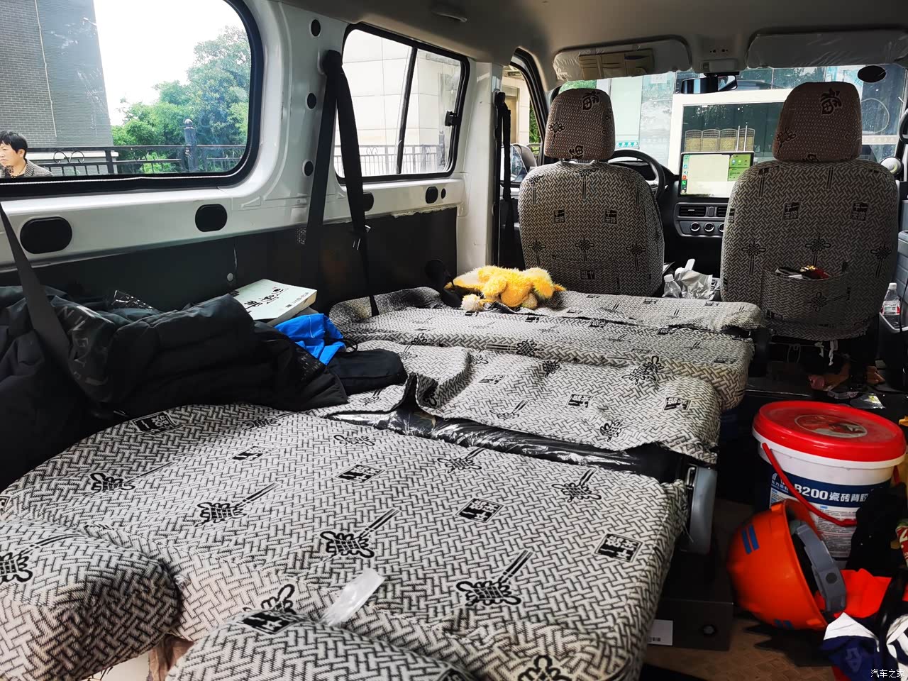 空间是真的大,平时拉人6个人绰绰有余,拉货的话6个立方,重量的话拉两吨应该没问题,本人拉过1.2吨的瓷砖,上坡轻轻松松不打盹。因为原车的第2排第3排座位只能立起来,不能放平,用起来没有想象中的方便,只能坐着靠着,不能躺着,因此我把二三排的座位都换成可放平的座位,现在二三排一放倒无缝衔接就是妥妥的一个大床。还可以折叠起来,当货车使用,扬光的空间已被我利用到了极致,