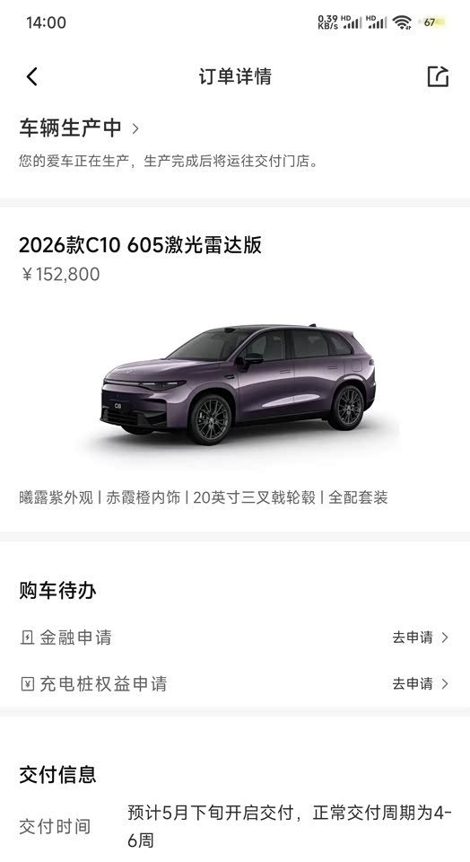 认识领跑这个品牌是在2022年,那一年去4s店试驾过(对比之后但最终还是选择了比亚迪的宋pro dmi旗舰版) 零跑不愧是量大管饱,性价比之王。 各个价位段的产品层出不穷,原本想买b10的,想着五一节有优惠,于是等等,没想4月30号26款的c10发布了,于是果断转定了26款的c10 产能很快。5月15号上市当天下的定29号车就到店了,不巧碰上端午节假期,等到6月3号才提的车。 空调10分的给力,而且还很省电,以前的送开空调得开到23,24度才能感觉到凉快,那么台是要凉的话,26度就已经很冰了,有时候得放到27度。