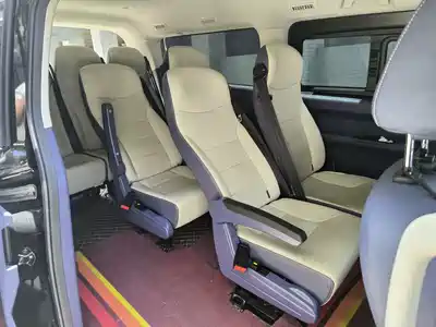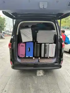 乘坐空间宽敞得很,每个位置都有足够的腿部空间。测试过最多的一次在9坐的模式下全部坐满人,后备箱还能放7个行李箱,每个乘客的行李都没有落下,有的时候需要帮客户拉一点东西,到酒店的话就把最后一排给他放倒,可以当成一座小货车用了,应急的时候还能派上用场,真挺好的。