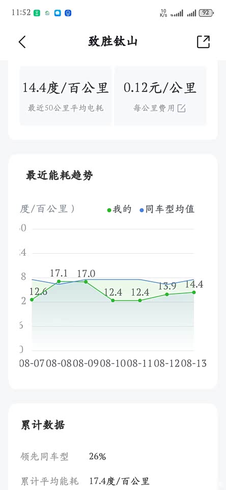 最近50KM电耗14.4/百公里,5633K面平均电耗17.4/百公里