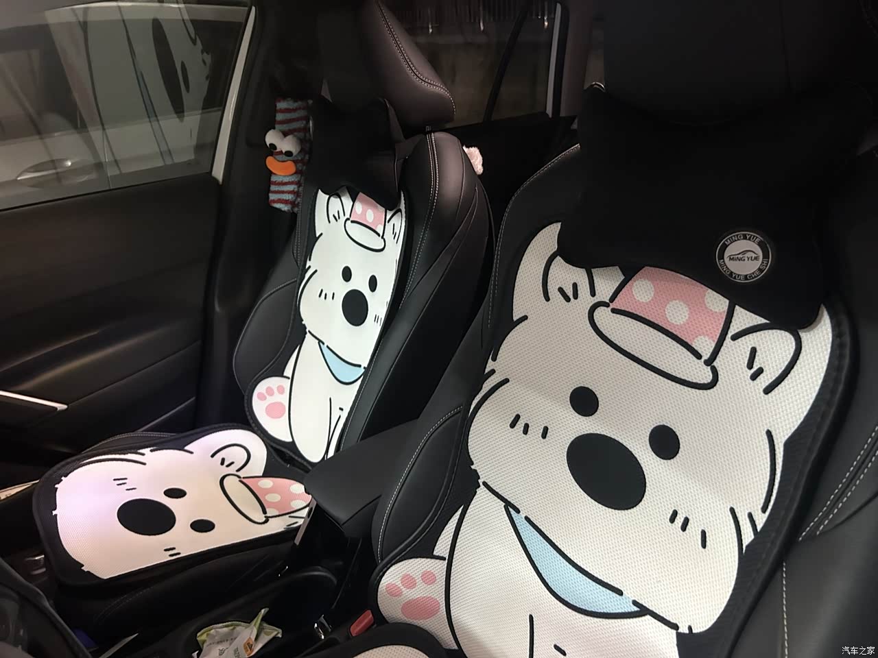 内饰是黑带点银的,经典黑色的配置,比较经典。座椅是皮的,坐起来很舒服但是有点热,所以我自己加了座椅垫,是我爱的小狗,这个垫子也非常的便宜好用!百元不到就可以前后排都配置上了!推荐推荐!!!!!