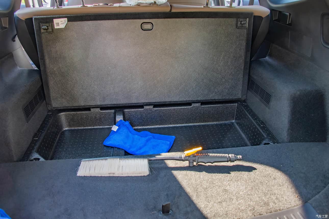 后备箱容积很大,特别是七座型的五座车,没有了第三排座椅,再加上后备箱的平板下又设计有大的凹下去的箱盒,可以把平时用不上的随车及自行购买的工具全都放进去还余有空间呢。