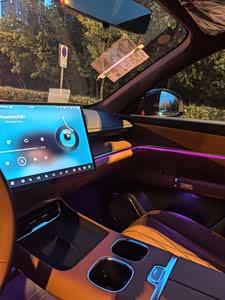内饰的设计风格是简洁的类型,中控大屏流畅度很加分。不过,座椅是仿皮材质,在触感和高级感的营造上还有提升空间。