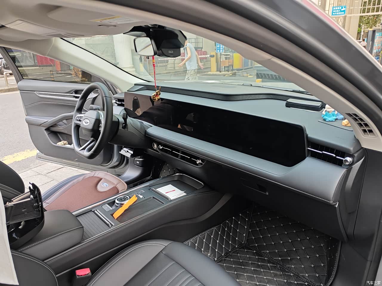 内饰整体简单大方,软包的位置很多,27寸大连屏在车子里面显得很协调,座椅的包裹性很强,坐着很舒服!