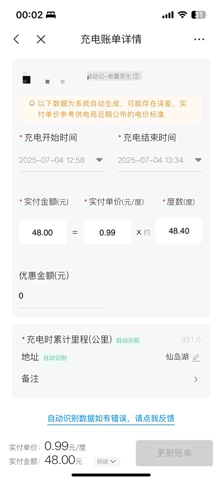 有次去乡镇,因为充电桩还没来安装,自身电量也不多,在公共充电桩充了一次,几乎1块钱1度,但是时间很快,15%到90%用了36分钟。