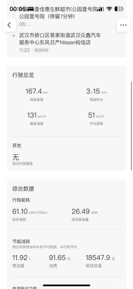 跑一趟武汉167.4公里,综合耗电量达26.49kWh,可能跟驾驶习惯有关。不过因为在小县城,单位离家只有5公里左右,充满一次电用半个月应该问题不大。