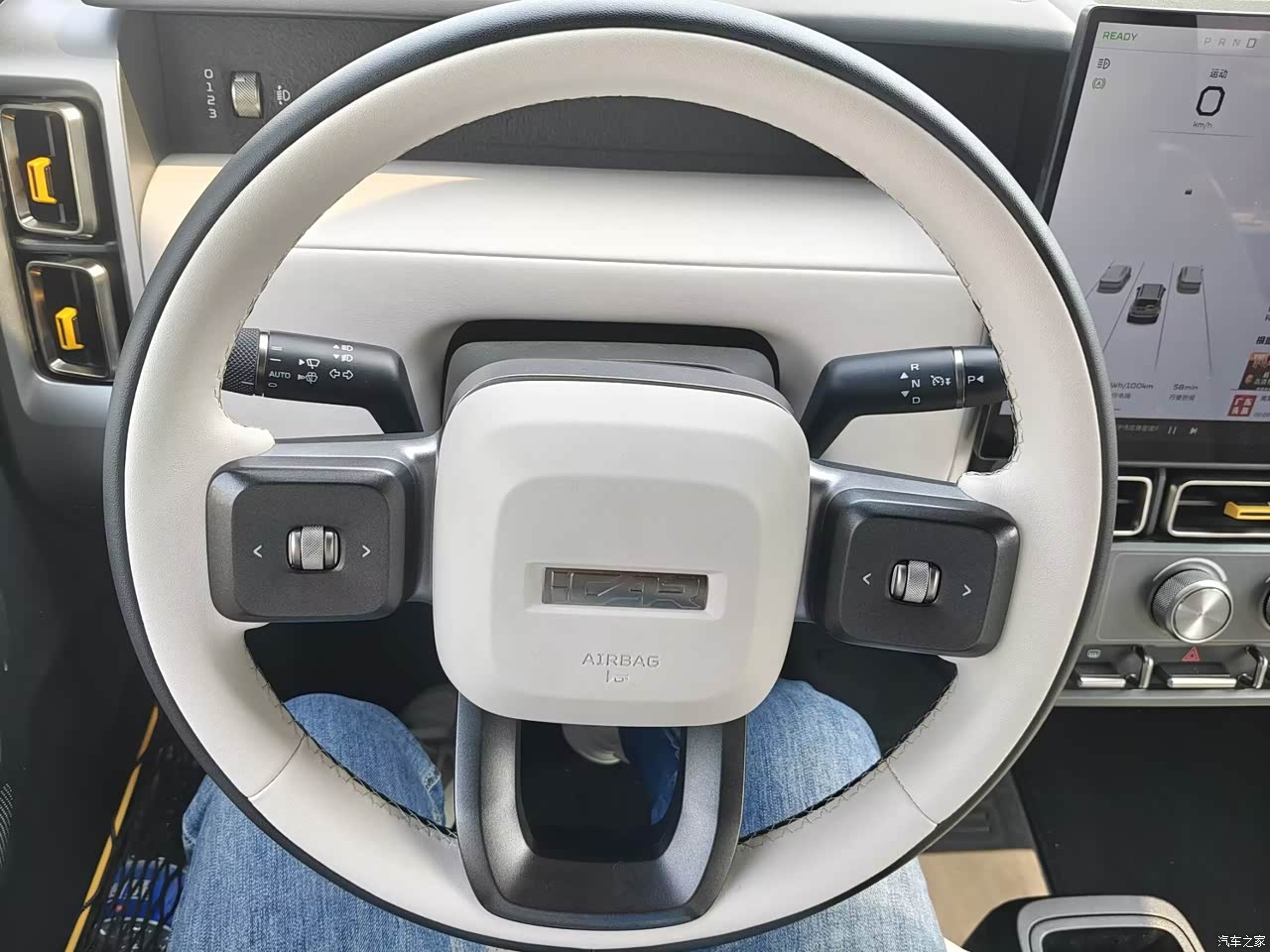 内饰的方向盘是白黑链接的,很是干净,方向盘不是很大,很秀气。
