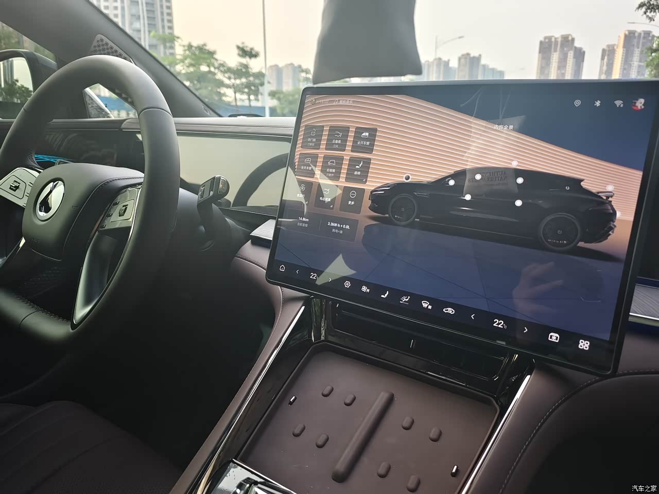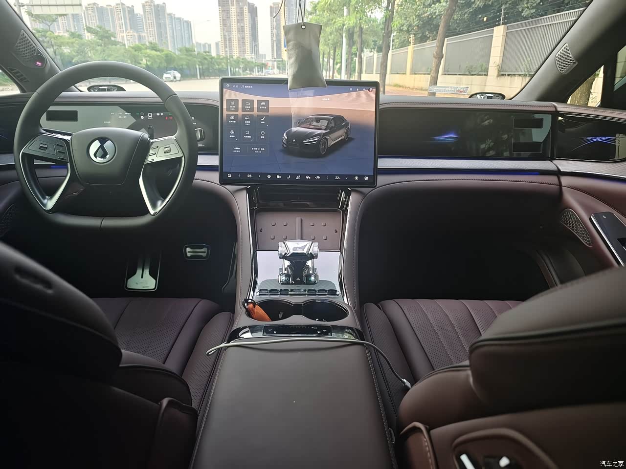 这车开出去,绝对不低调!那个前脸的大灯,设计得挺特别的,有人觉得像未来飞船,有人觉得有点怪,尾灯很有标志性一眼就能跟别的车分辨出来,反正挺有争议。但不管怎么说,你把它往路边一停,那气势是真足!车又长又宽,还矮趴趴的,看着就很运动。特别是那个无框车门一打开,经常能感觉到旁边人好奇的目光。 尤其是圆规掉头,车头往里面车位一怼,再把车尾巴挪进去,那一刻就值回票价了。 坐进车里,挺高级的。摸得到的地方基本都是软软的皮子,手感不错。中控那三块大屏幕够大够清楚。最让我觉得方便的是,主要的功能键例如云撵升降底盘启动车辆之类的开关都是保留了实体按键,这一个设计非常不错的。 开起来:新车一到就跑过一段小长途,又快又稳,不会有传统电车的推背感,一冲一冲的,舒适模式下虽然也有推备感但是是那种很从容的感觉,像开一辆大V8一样,符合一辆豪华GT的定位以及驾驶感受。显得稳重可靠!