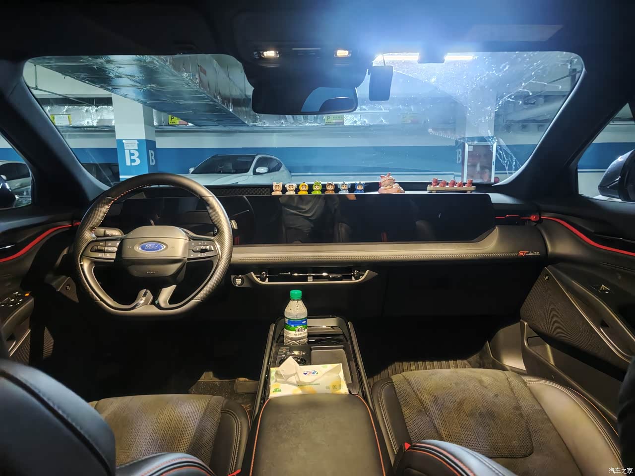 汽车内饰以黑色为主,加以红色条纹装饰,大连屏科技感十足,行驶5个月6300公里期间,内饰无异响,车机无死机,虽然没有切换模式和空调控制等实体按键,但“你好福特”基本解决所有问题。