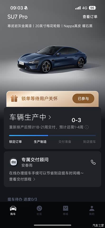 2024年9月订车,12月申请延期,1月重新排产等车太久,且线上交付顾问态度不好导致等车期间屡次心态失控投诉400,在别人普遍2-5,3-6下线的时候在0-3的第二天才下线。在此期间交付没有给予我及时的回复以及指标上牌的信息,甚至因为第一个线上交付顾问态度不好导致我选择更换交付,在第二个交付交接之前全程是我自己向销售向其他车友询问情况得知。