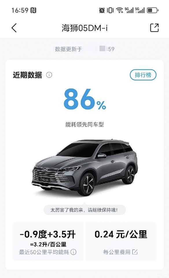 能耗成本: 插混车型既能充电,又能加油,所以根据各人用 车情况的不同,能耗成本会有较大的差异。 我的海狮05DM提车三个月,总里程3820km, 其中HEV里程1274km,EV里程2546km。加 92#汽油,七块多一升,充自家谷电,五毛多一度。按照HEV里程百公里五个油,EV里程百公里十五度电来算,共花费约480元油费、220元电费,折合每年开销油电费约3000元。对比同级别燃油车,每年行驶同样的公里数,油耗按百公里七个油计算,需花费约8000元燃油费,能耗成本每年可省5000多元。