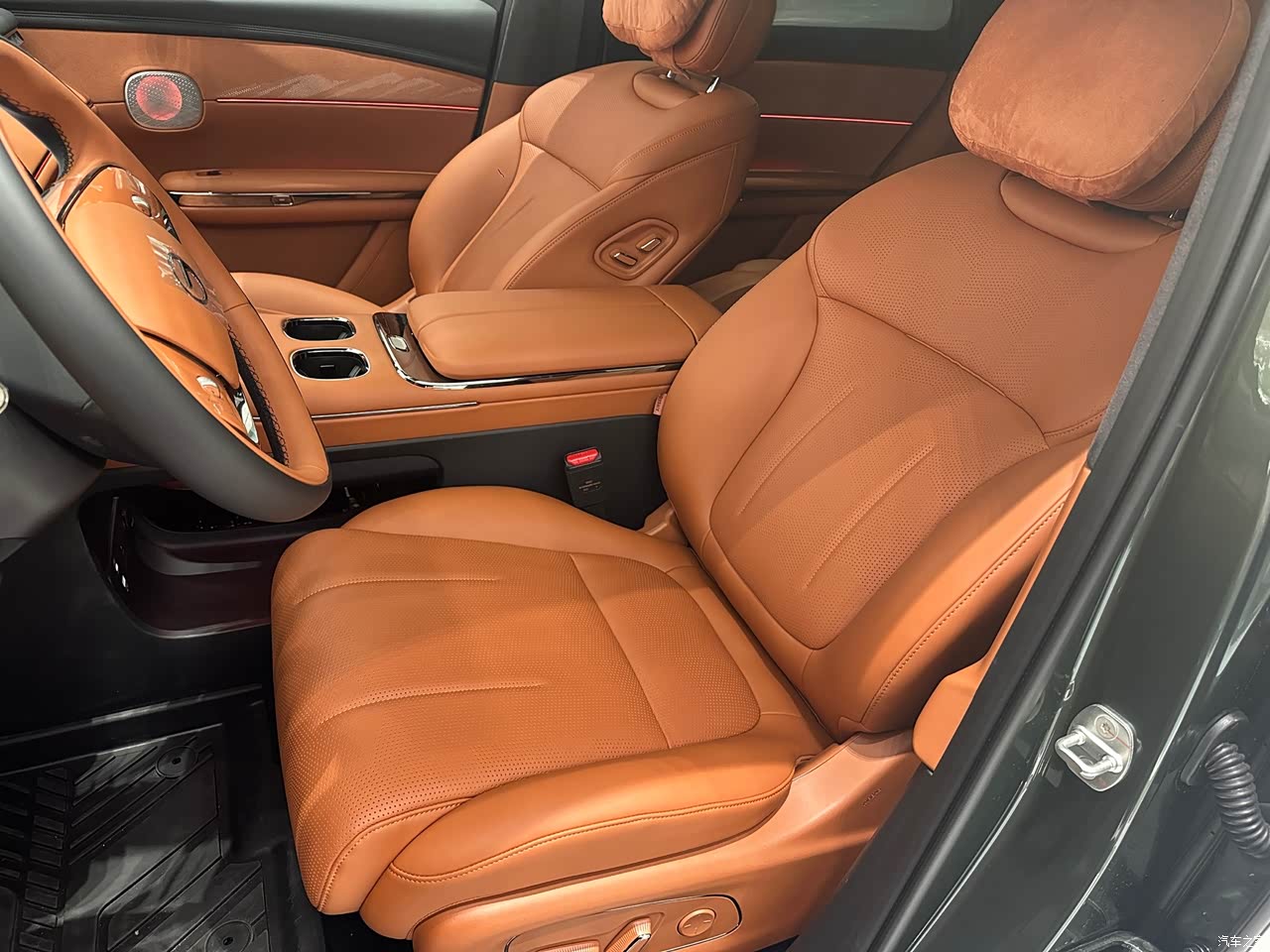 整车空间很大 ,二排是可以放平的 ,老公183坐进去头跟腿都有充足的活动空间 ,座椅贴合我们人体工学坐起来非常舒适 ,真皮座椅 ,右二排有老板腿拖 ,配备头枕 ✨值得一提的是新车内饰 ,座椅都是没有异味的 ,不用担心新车皮质或甲醛问题 。