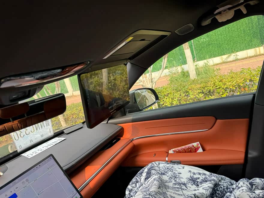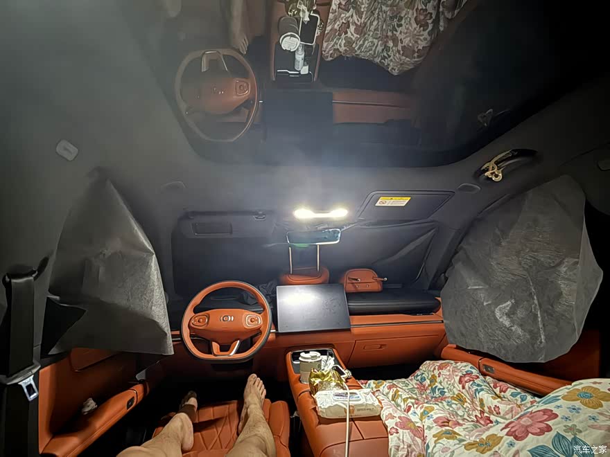 进入车内,橙色内饰简直是点睛之笔,一下子就让整个座舱氛围变得活泼又温馨 ,和沉稳的外观形成反差萌。车内大面积采用软质材料包裹,触感非常细腻,无论是中控台、门板还是座椅,摸起来都很舒服,档次感十足。 这台车的空间表现堪称一绝。车身尺寸为483719201690mm ,轴距达到2905mm,车内空间非常宽敞。我身高180cm ,坐在驾驶位,头部和腿部都有很充裕的空间,调整好座椅后,后排坐三个成年人也不会觉得拥挤,腿部空间能轻松翘起二郎腿,头部也不会顶到车顶。而且它的座椅功能超级丰富,主副驾驶席都有加热、通风、按摩和记忆功能,副驾驶还有零重力座椅,有时候跑长途,打开按摩和通风功能,整个人都能放松下来,一点都不会觉得累。后排座椅不仅支持28 - 41°的电动调节,还配备了通风、加热功能,后排小桌板也很实用,孩子在车上写作业、吃东西都很方便。另外,它还有女王座、贵妃椅、懒人沙发、大床房四种舒享模式,出去玩累了,就能切换到大床房模式,躺在车里休息,真的太惬意了。它的储物空间也很多,全车有33处储物空间,像门板拉手盒、中控镂空区,都能放不少东西。后备箱是双层设计,容积有763升,出去玩的时候,帐篷、烧烤架、行李箱什么的都能轻松装下,实用性拉满。