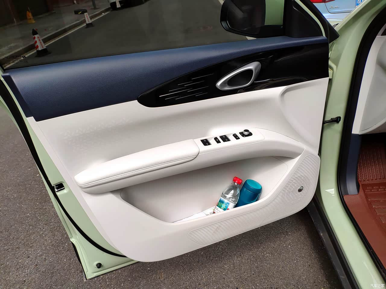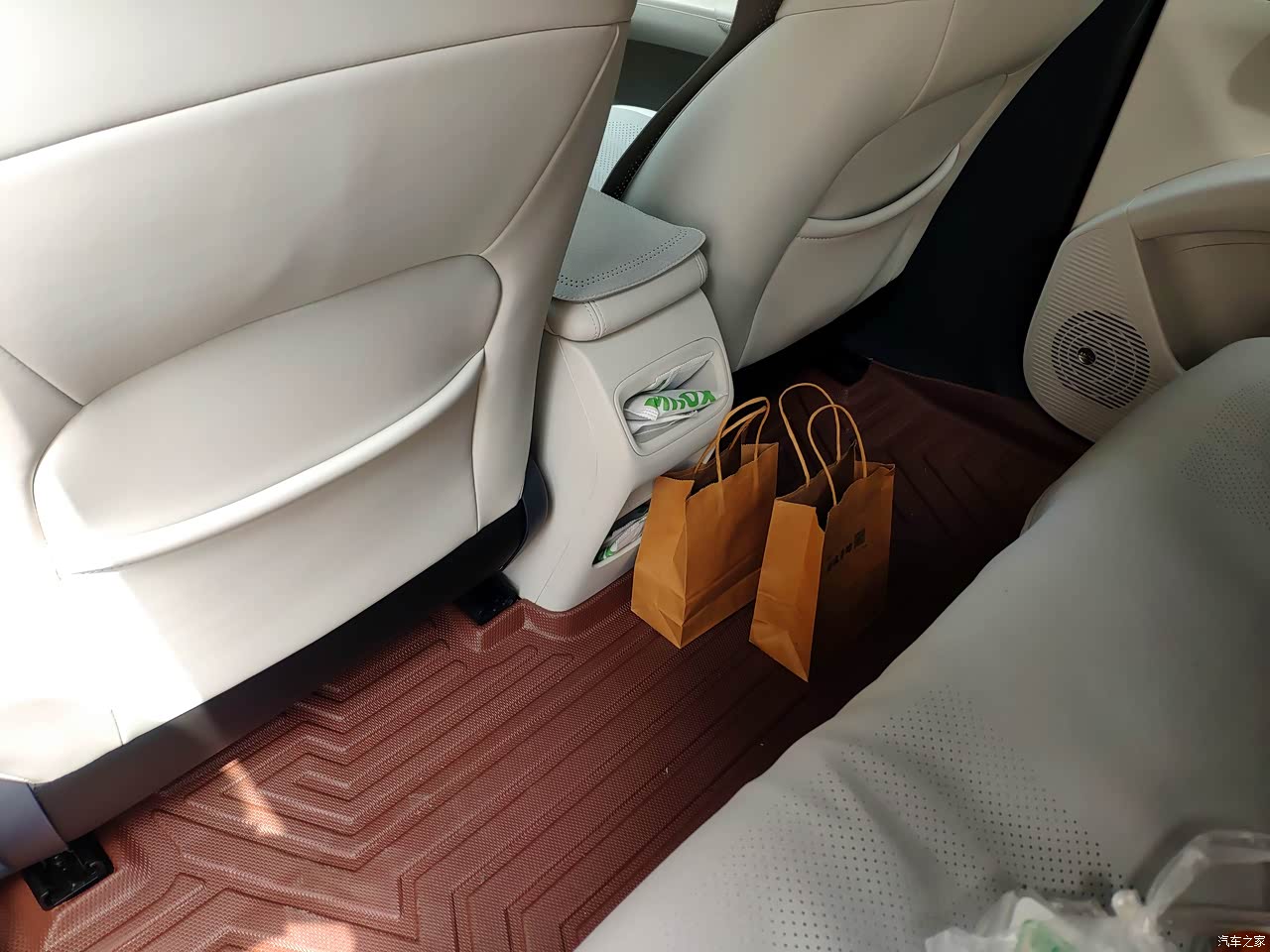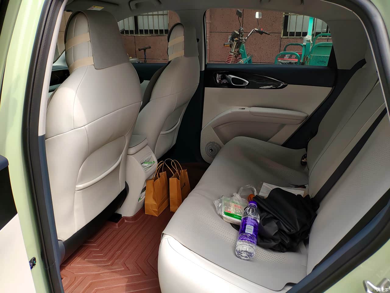 后排的地面平平整整的,前后之间的距离也有半米,人多坐着也不会特别拥挤的。车门储物格设计的也是大的,放东西很实用。后备箱两个20寸的行李箱外加三箱饮料都还有剩余的地方,储物方面也很不错。