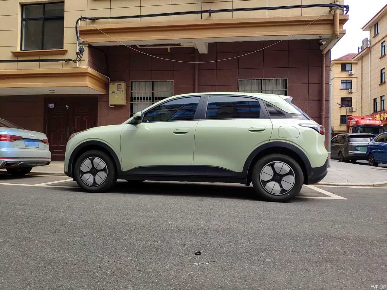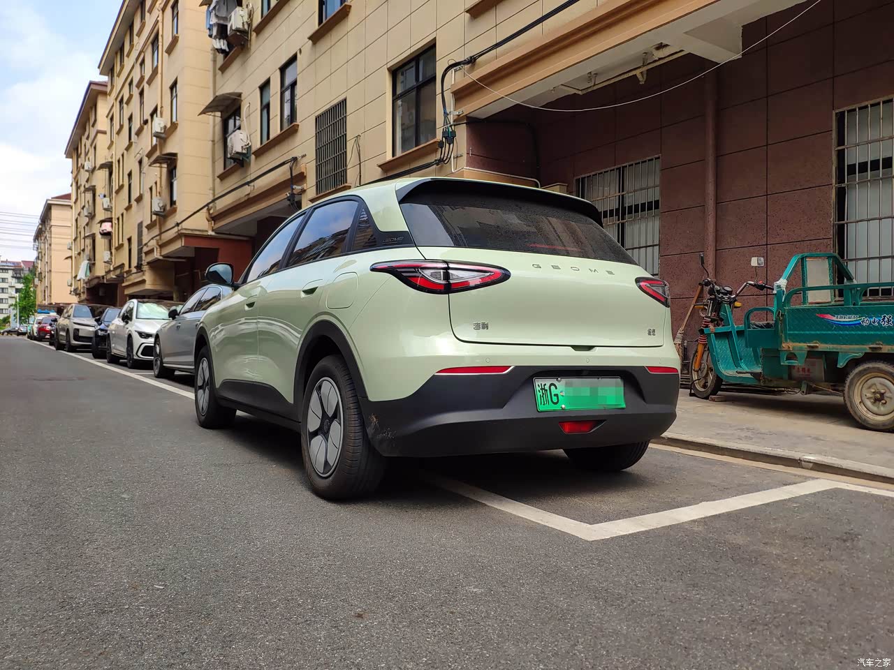 车身线条看着很圆润,但是前后的大灯设计的立体,深红色和银白色的灯带亮起之后就很犀利。还有车身看着很匀称,搭配青色的车漆时尚感也很不错。