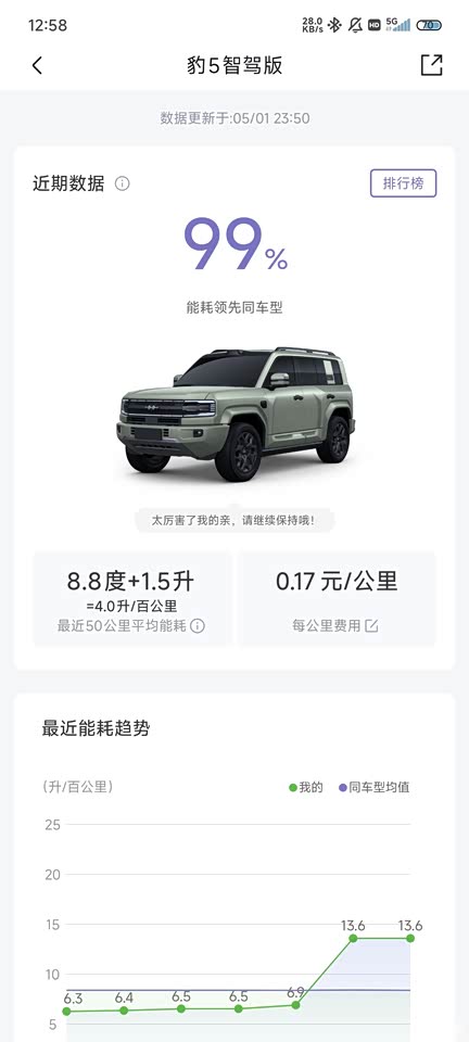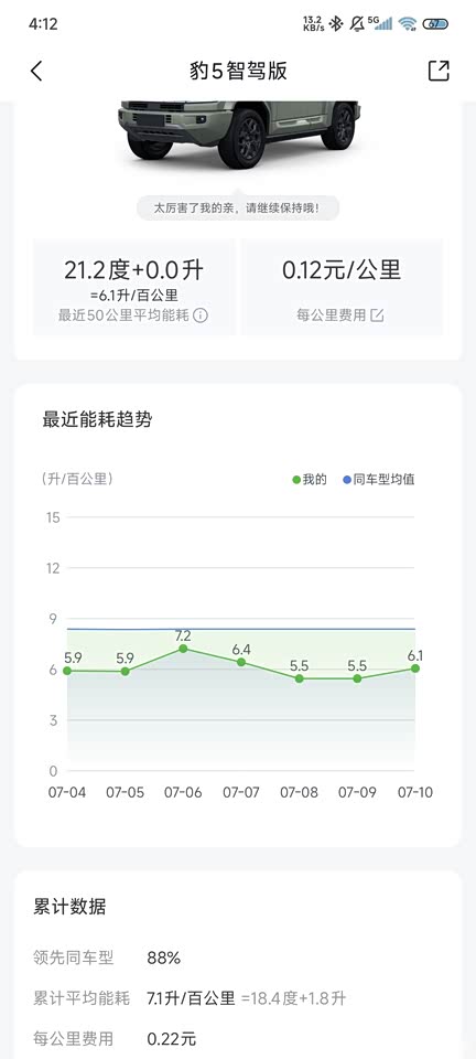 最不满意的绕不开纯电续航了,纯电100公里,只够出门代个步,上班单趟25公里,加上哨兵模式耗点电,第二天就得烧点油了。不过续航里程也不算虚标,个人用车比较省,电耗大概21这样,纯电可以跑100冒点头。 还有就是23款和25款外观最大的区别,塑料饰板,25款车身同色确实越看越耐看,一个不注意开门磕一下墙就非常明显,好在里面是塑料的,不用担心生锈。有一个槽点,网上居然没有25款山脉绿的补漆笔,23款绿色和25款绿色是有色差的,真希望官方能整个原厂绿色的补漆笔🌹