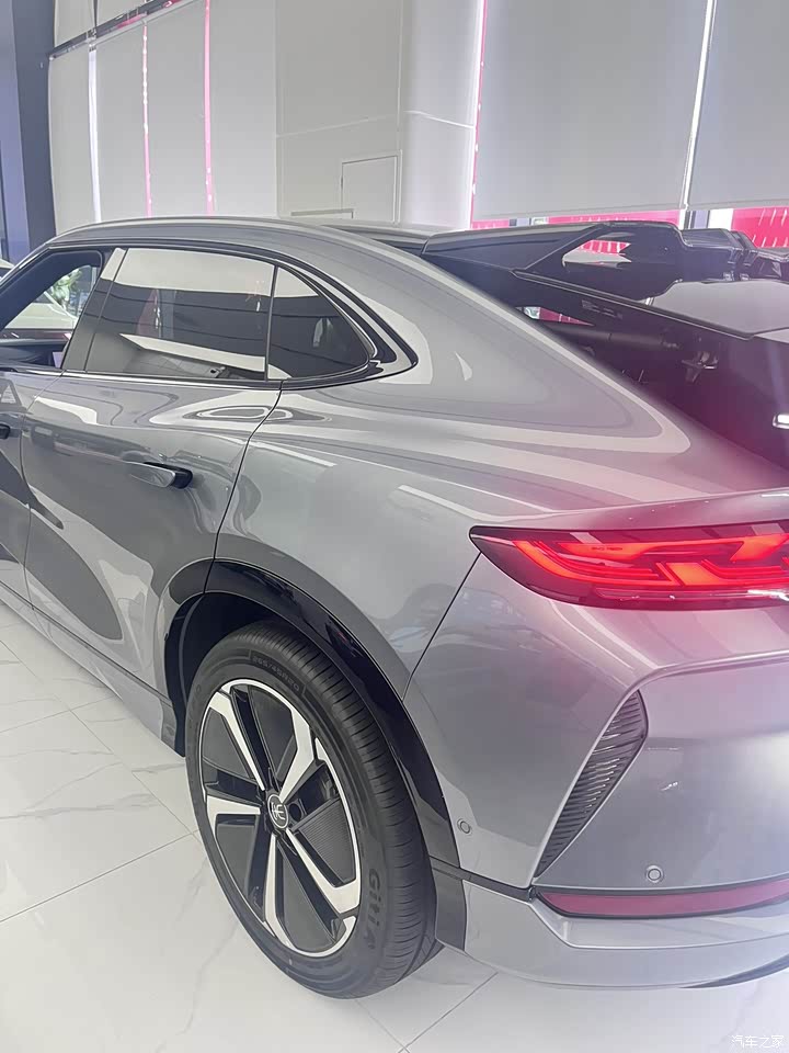 前脸采用龙须饰条连接龙晶大灯,搭配溜背式车身和低趴姿态,电动尾翼随车速自动升降,兼顾空气动力学与视觉冲击力。无框车门+隐藏式把手提升了科技感与运动气质,配色更显优雅。