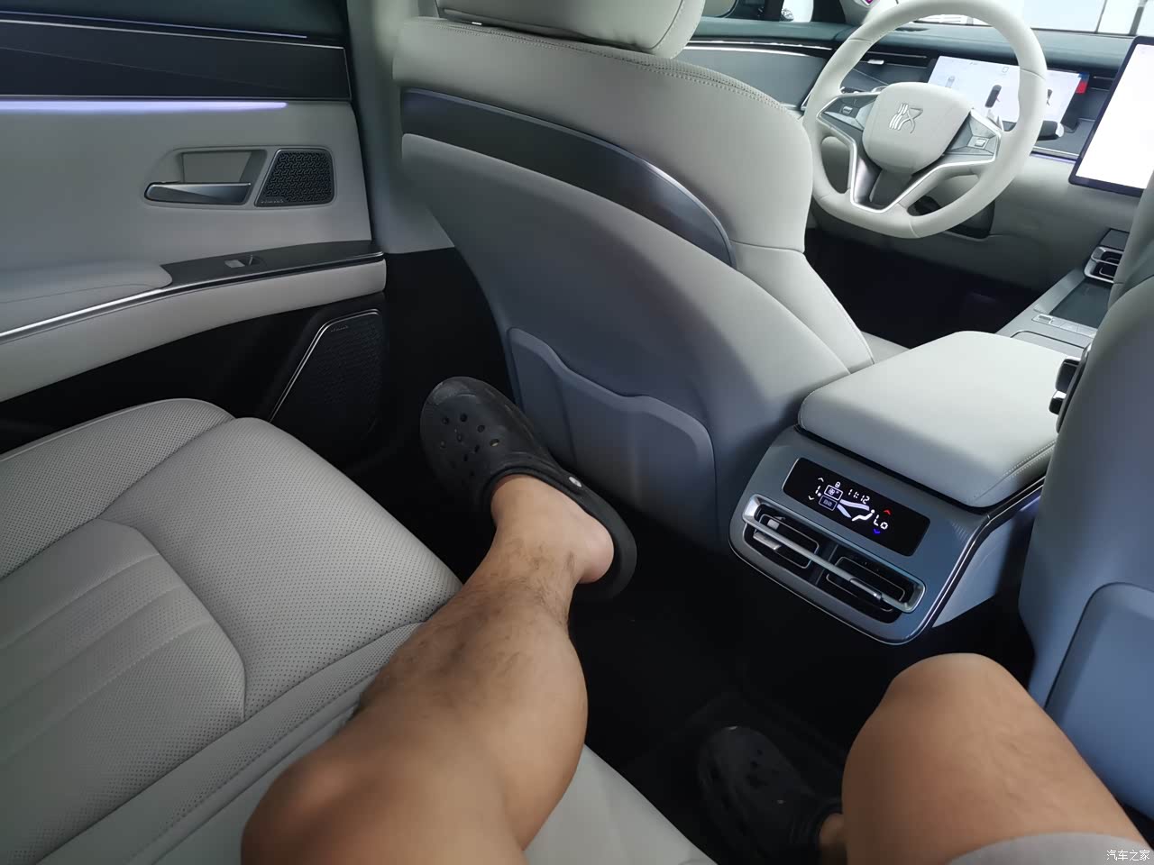 汉L这车车身超过了5米,是和奥迪A6、宝马5系同一个级别的车。坐在后排感觉是真的爽,大腿随便放就是。对了这款尊享是没有车载冰箱的哈,得再上一个配置。